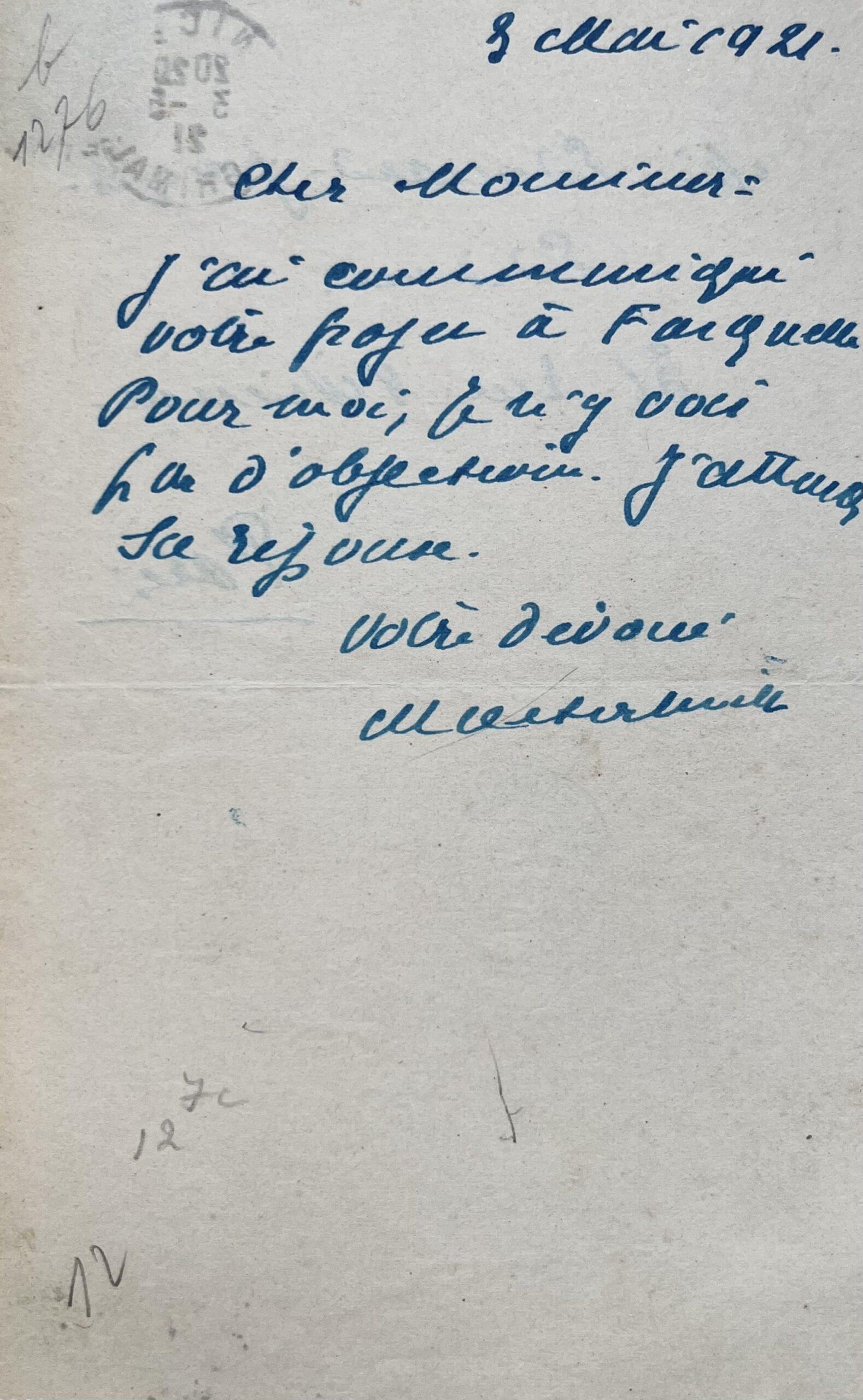 "Cher Monsieur. J'ai communiqué votre projet à Fasquelle. Pour moi, je n'y vois pas d'objections. J'attends sa réponse".