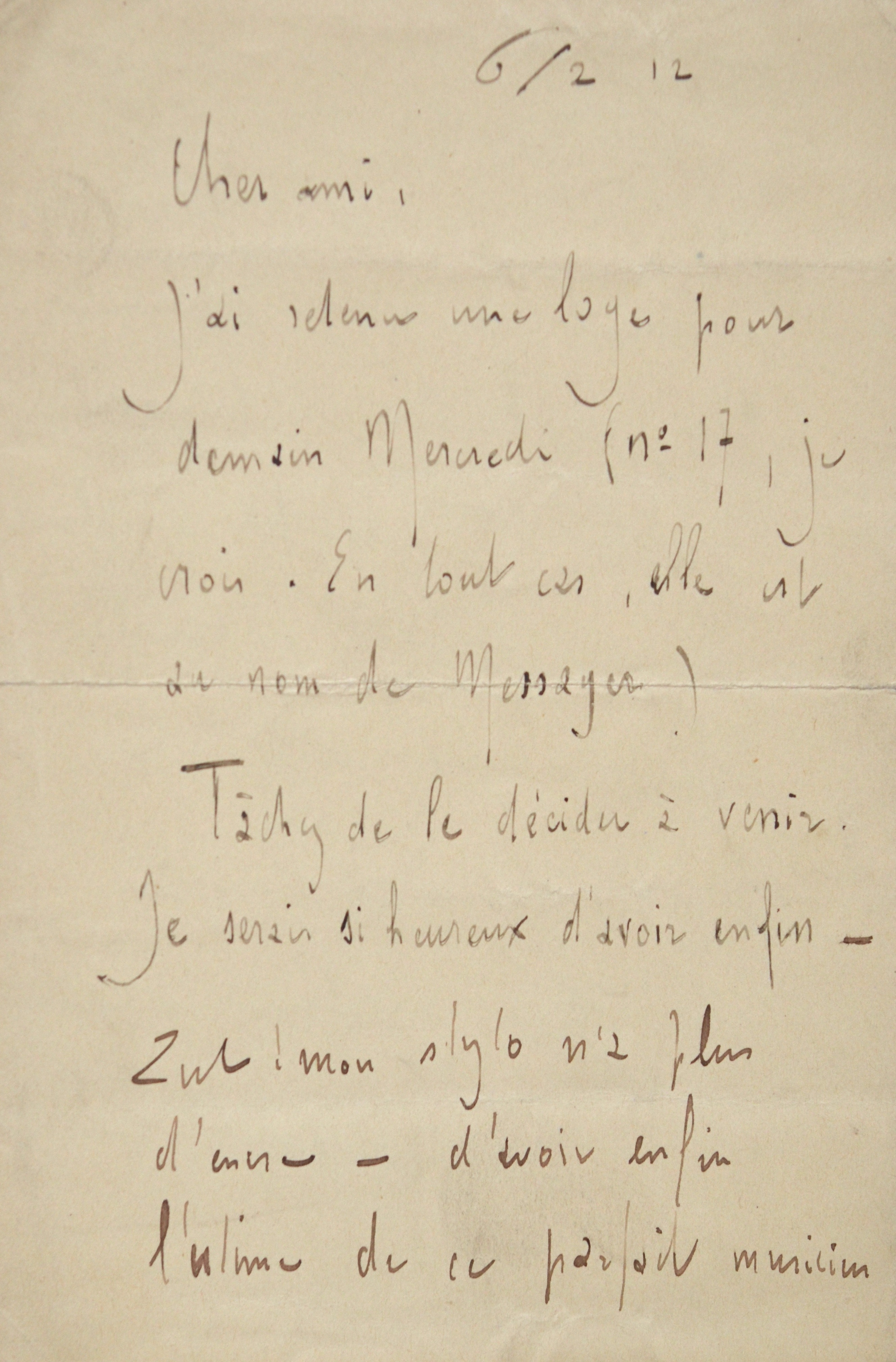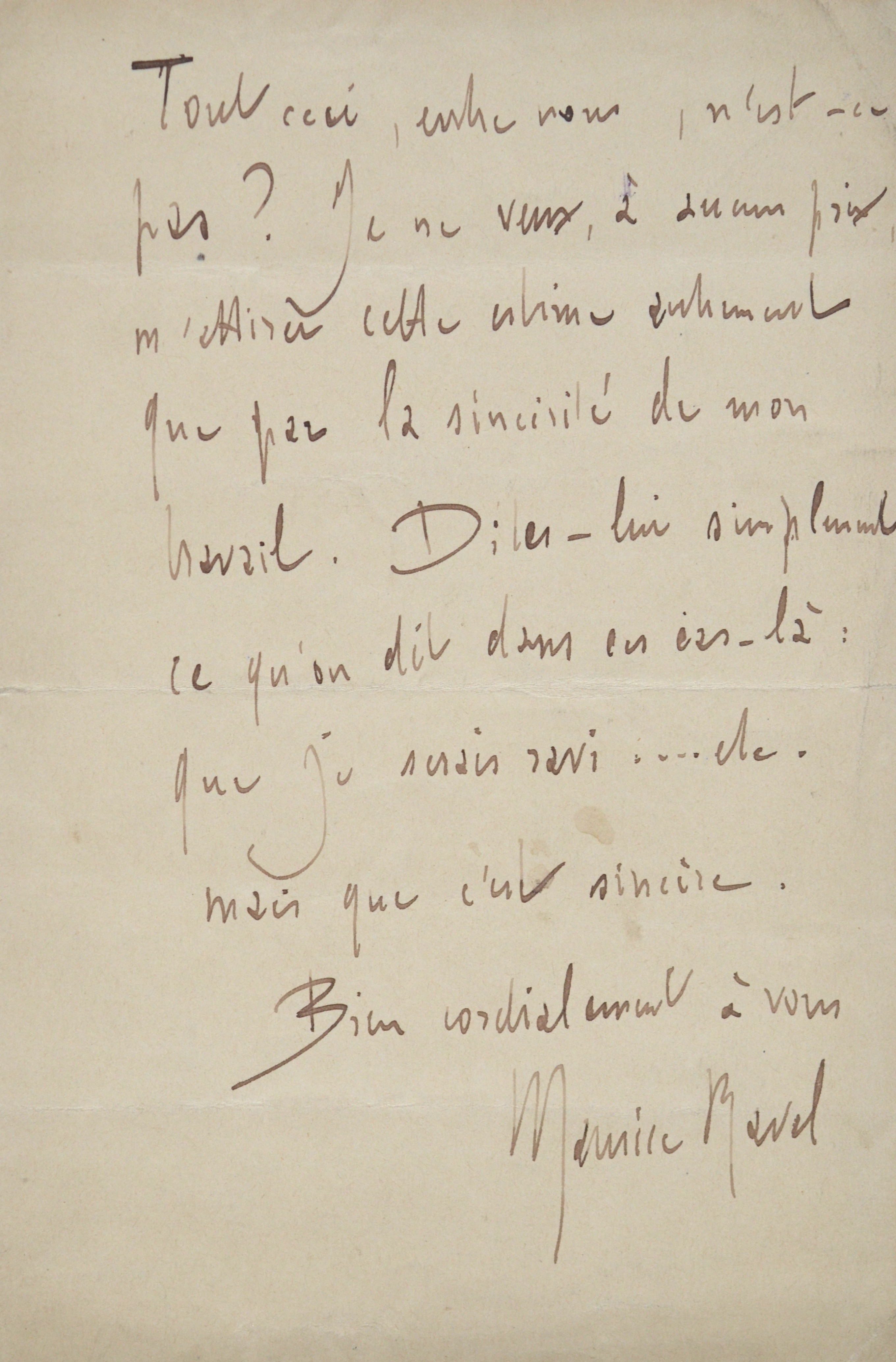 Très intéressante lettre de Ravel tout à fait révélatrice des doutes qui le traversent sur son génie, après une série d'échecs du public et de la critique (dont L'Heure Espagnole, premier ouvrage lyrique du compositeur), venant après son triple échec au prix de Rome. Méconscient de son génie, Ravel souhaite, par cette lettre, - et avec une réelle sincérité, s'attirer la considération d'un compositeur très académique et sans âme, André Messager (1853/1929). « Cher ami, J'ai retenu une loge pour demain mercredi (n°17 je crois. En tout cas, elle est au nom de Messager). Tâchez de le décider à venir. Je serais si heureux d'avoir enfin zut ! mon stylo n'a plus d'encre d'avoir enfin l'estime de ce parfait musicien. Tout ceci, entre nous, n'est-ce pas ? Je ne veux, à aucun prix, m'attirer cette estime autrement que par la sincérité de mon travail. Dites-lui simplement ce qu'on dit dans ces cas là : que je serais ravi ... etc. mais que c'est sincère. Bien cordialement à vous. Maurice Ravel. »