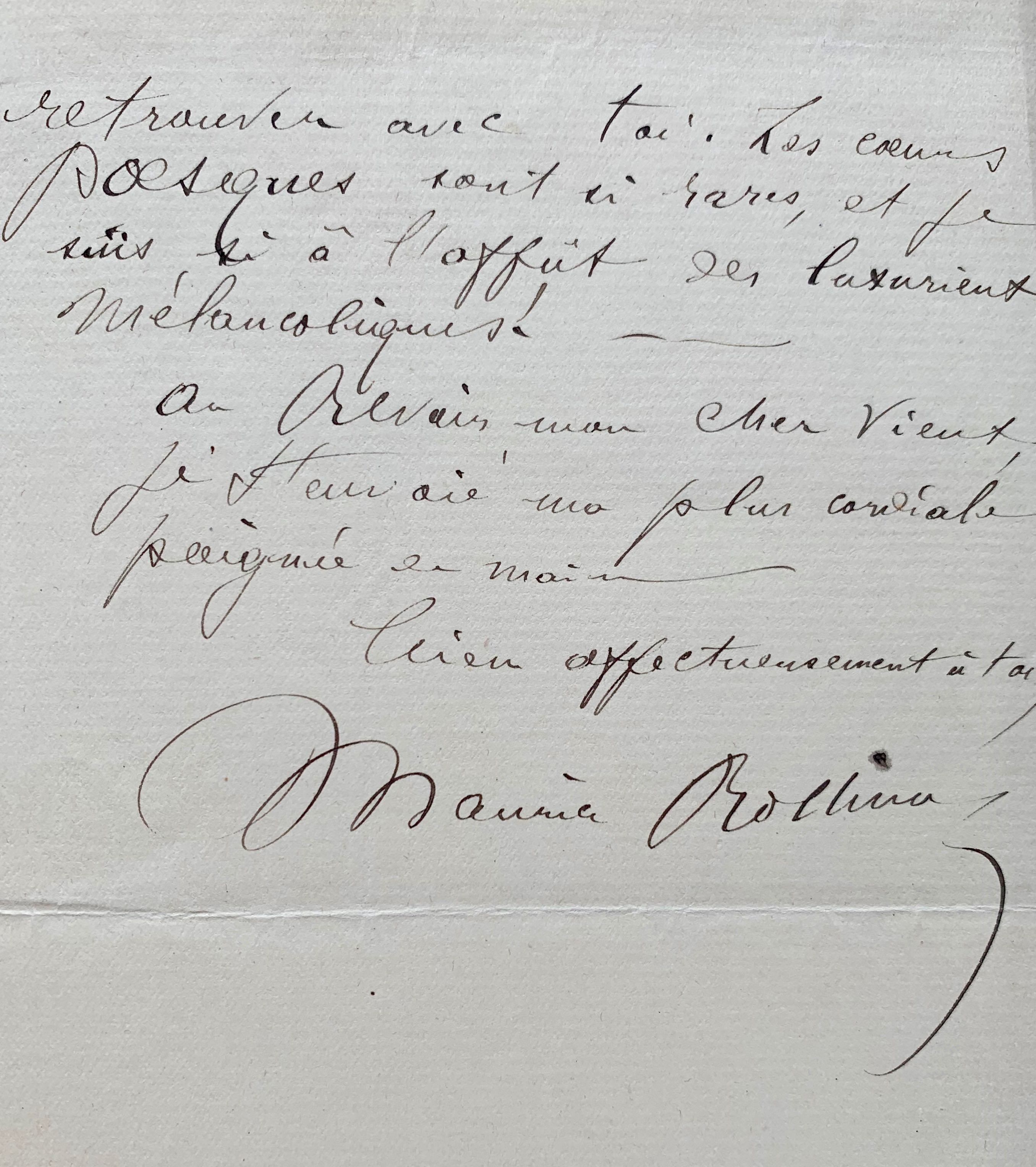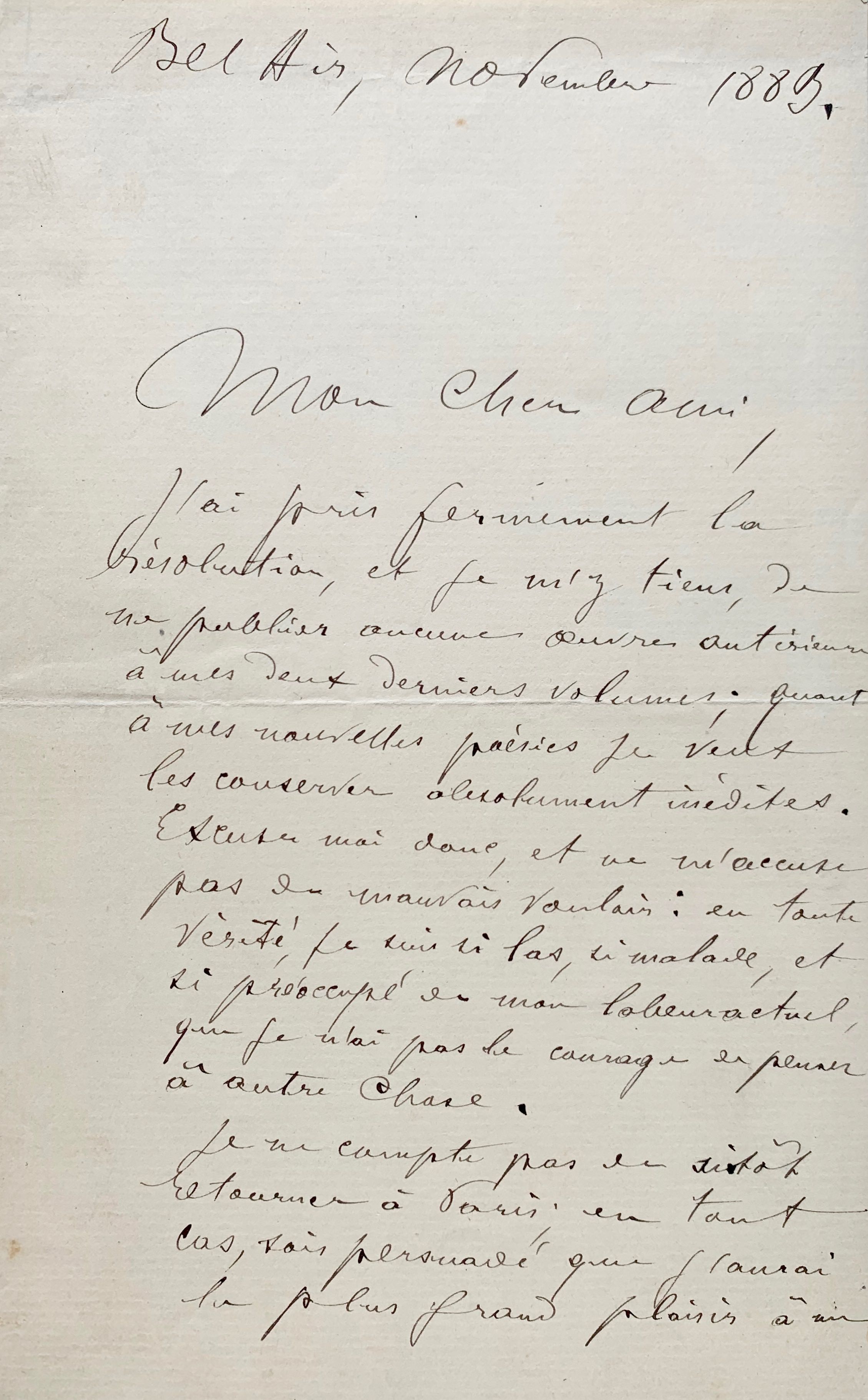 "J'ai pris fermement la résolution, et je m'y tiens, de ne publier aucune oeuvre antérieure à mes deux derniers volumes ; quant à mes nouvelles poésies, je veux les conserver absolument inédites. Excuse-moi donc, et ne m'accuse pas du mauvais vouloir : en toute vérité, je suis si las, si malade, et si préoccupé de mon labeur actuel, que je n'ai pas le courage de penser à autre chose. Je ne compte pas de si tôt retourner à Paris ; en tout cas, sois persuadé que j'aurai le plus grand plaisir à me retrouver avec toi. Les coeurs poétiques sont si rares, et je suis si à l'affût des luxurieux mélancoliques! [...]".