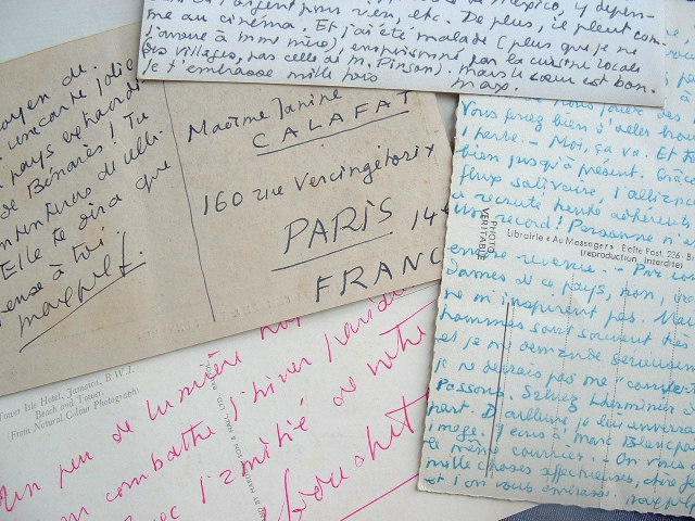 Max Pol Fouchet (Saint-Vaast-La-Hougue, 1913/1980)Cartes écrites par Max-Pol Fouchet, de différents endroits de la planète. Brazza, 25 juillet 50. «[...]. Tout va bien, jusqu'à présent. Grâce à mon flux salivaire, l'alliance de Brazza a recruté trente adhérents de plus. Un record ! Personne n'en est encore revenu. Par contre, les dames de ce pays, non, vraiment, ne m'inspirent pas. Mais les hommes sont souvent très beaux ; et je me demande sérieusement si je ne devrais pas me convertir... Passons [...]». Mexico, 16 sept. 1953. Il est retenu dans le pays. «Ici, nous sommes dans la poisse, à cause de l'exposition qui n'arrive toujours pas. [...]. Chevalier écume et moi je piétine sur place, n'ayant plus rien à apprendre de Mexico [...]», etc.
