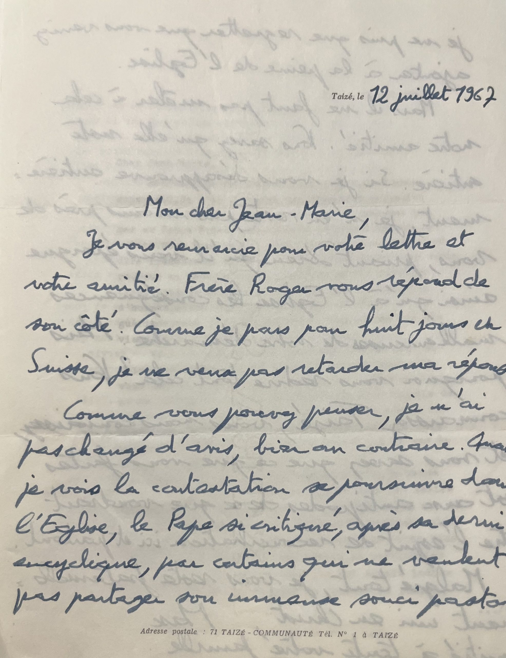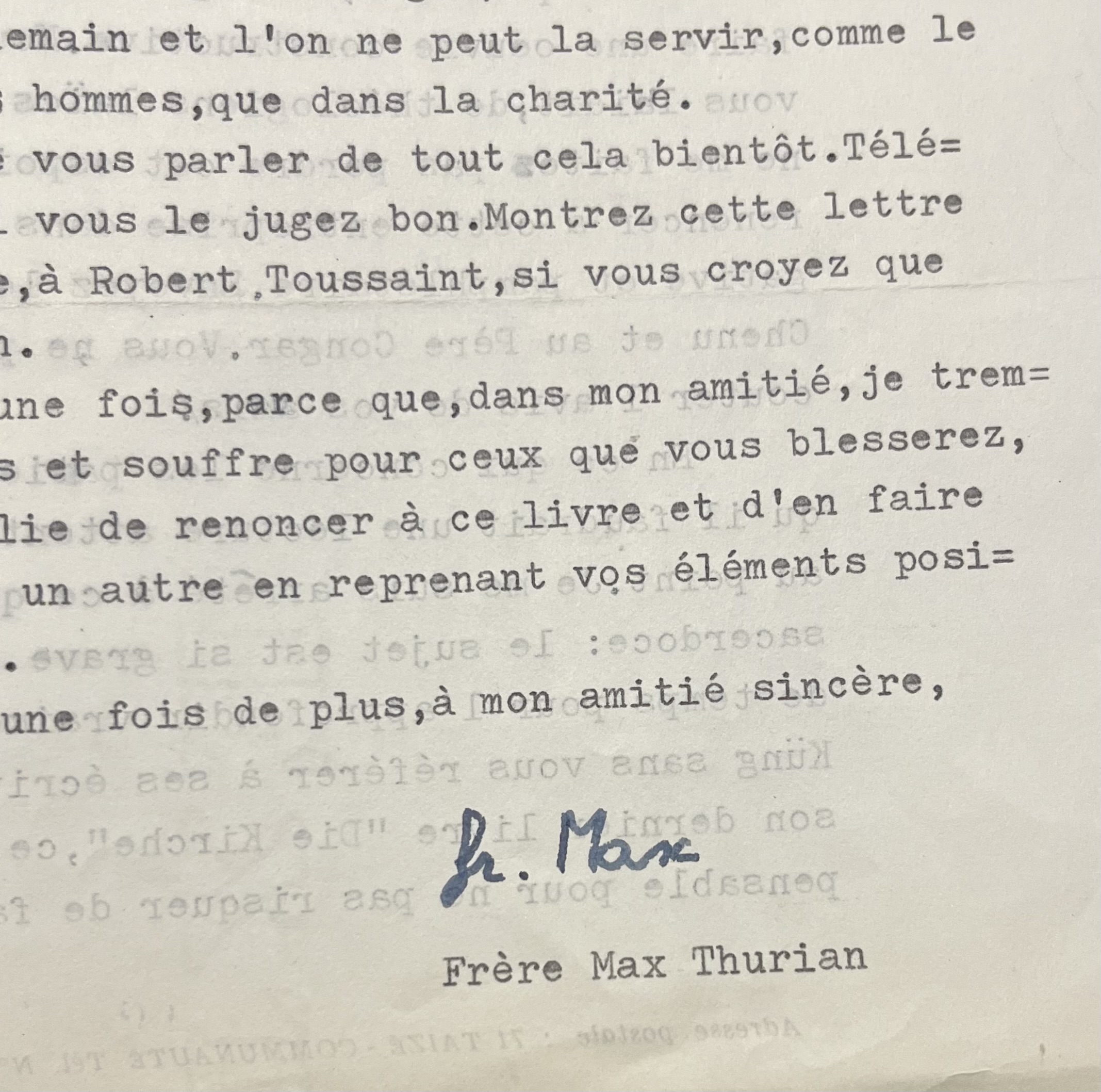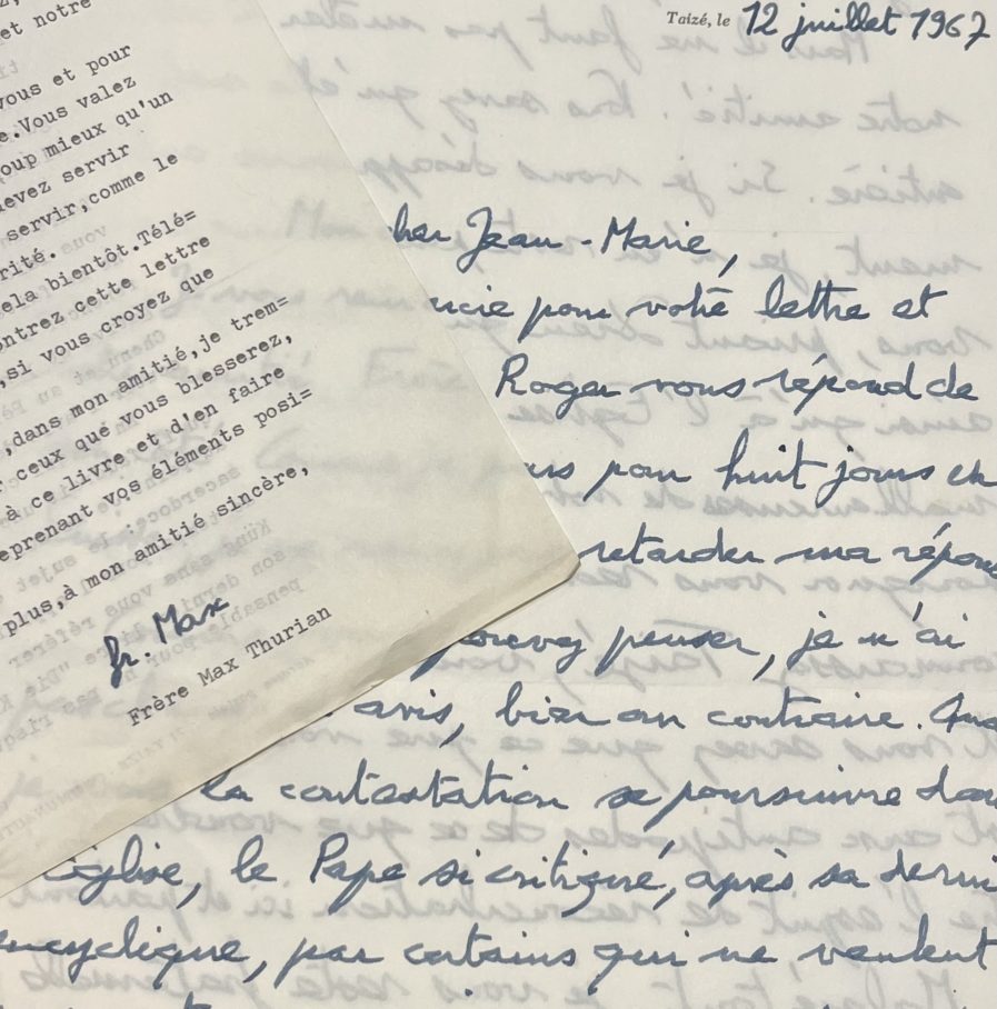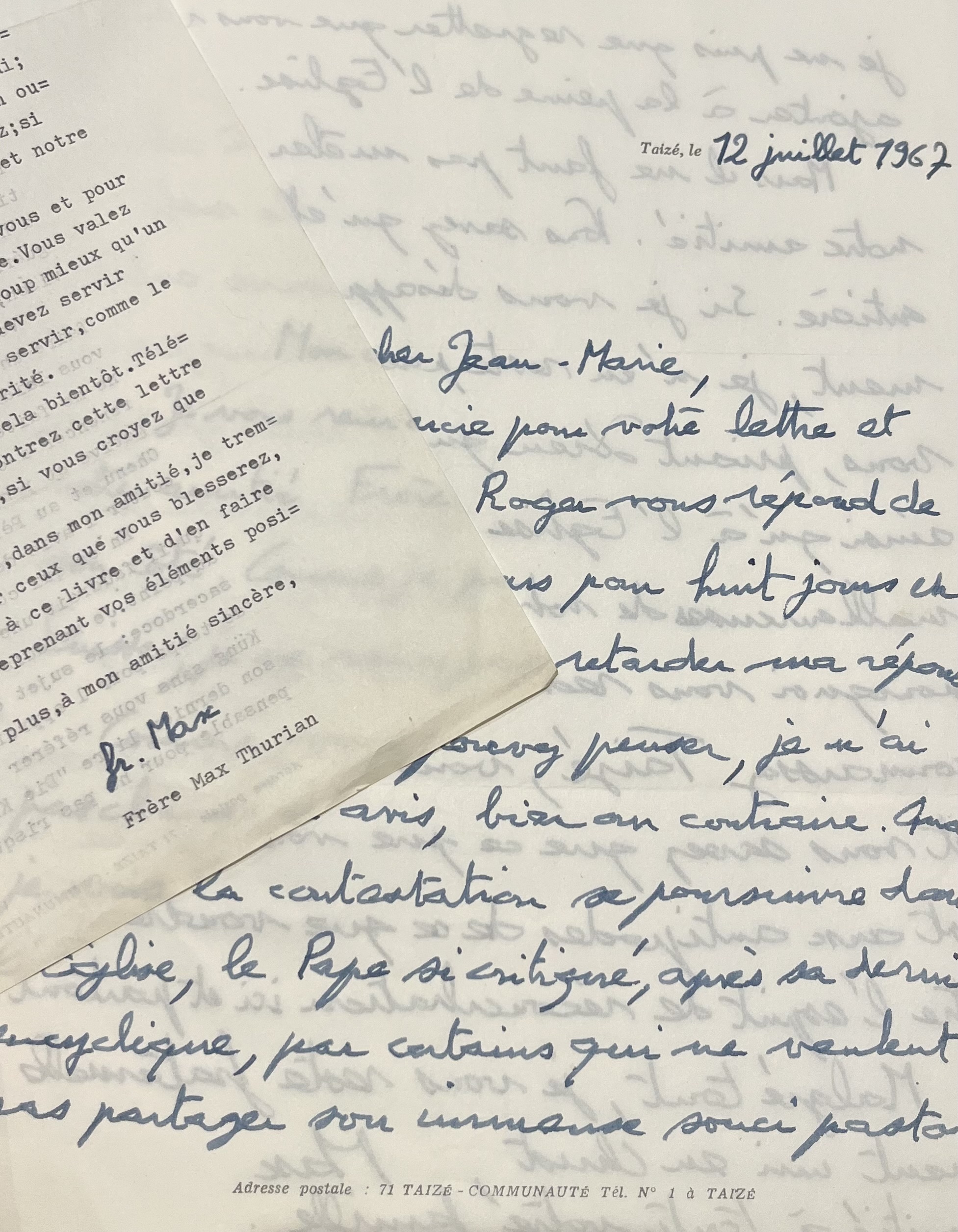 Max Thurian (Genève, 1921/1996)Par ces deux lettres, Max Thurian tente de dissuader son ami Jean-Marie Paupert de publier son ouvrage "Vieillards de chrétienté et chrétiens de l’an 2000" dans lequel il s'attaquait avec virulence au conservatisme de l'Église catholique, ayant été enthousiasmé par le concile Vatican II :