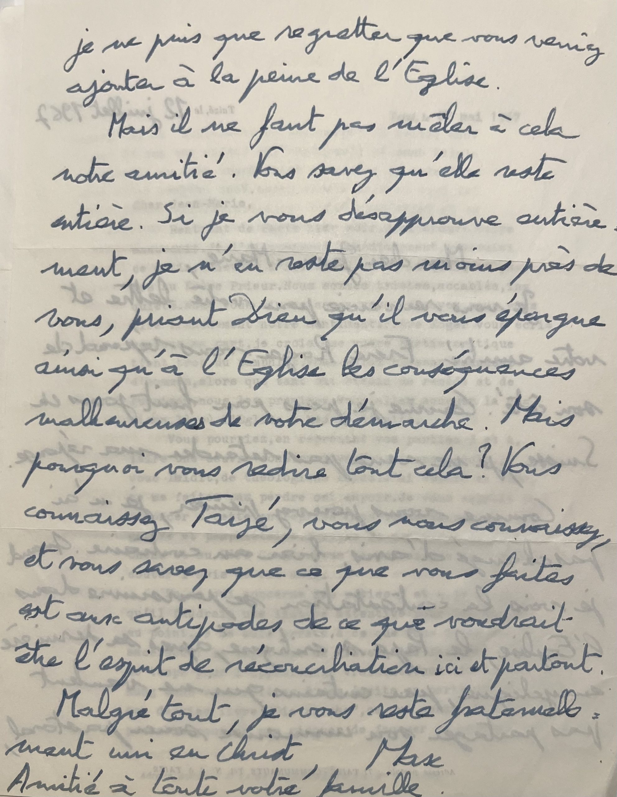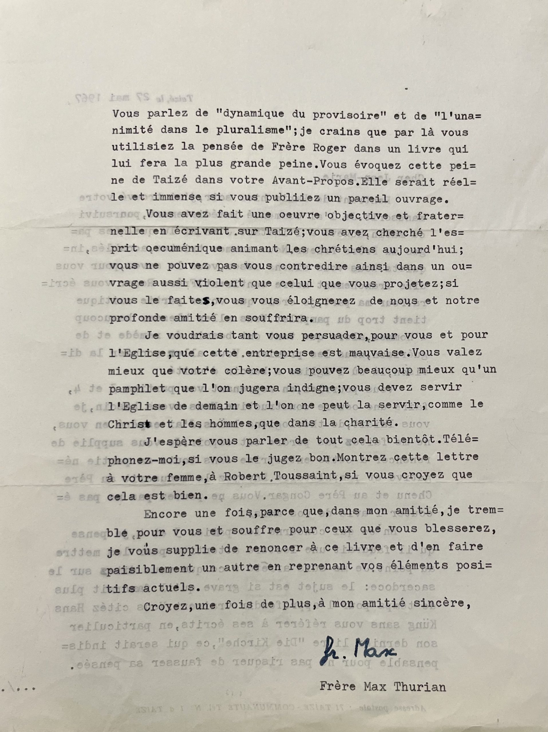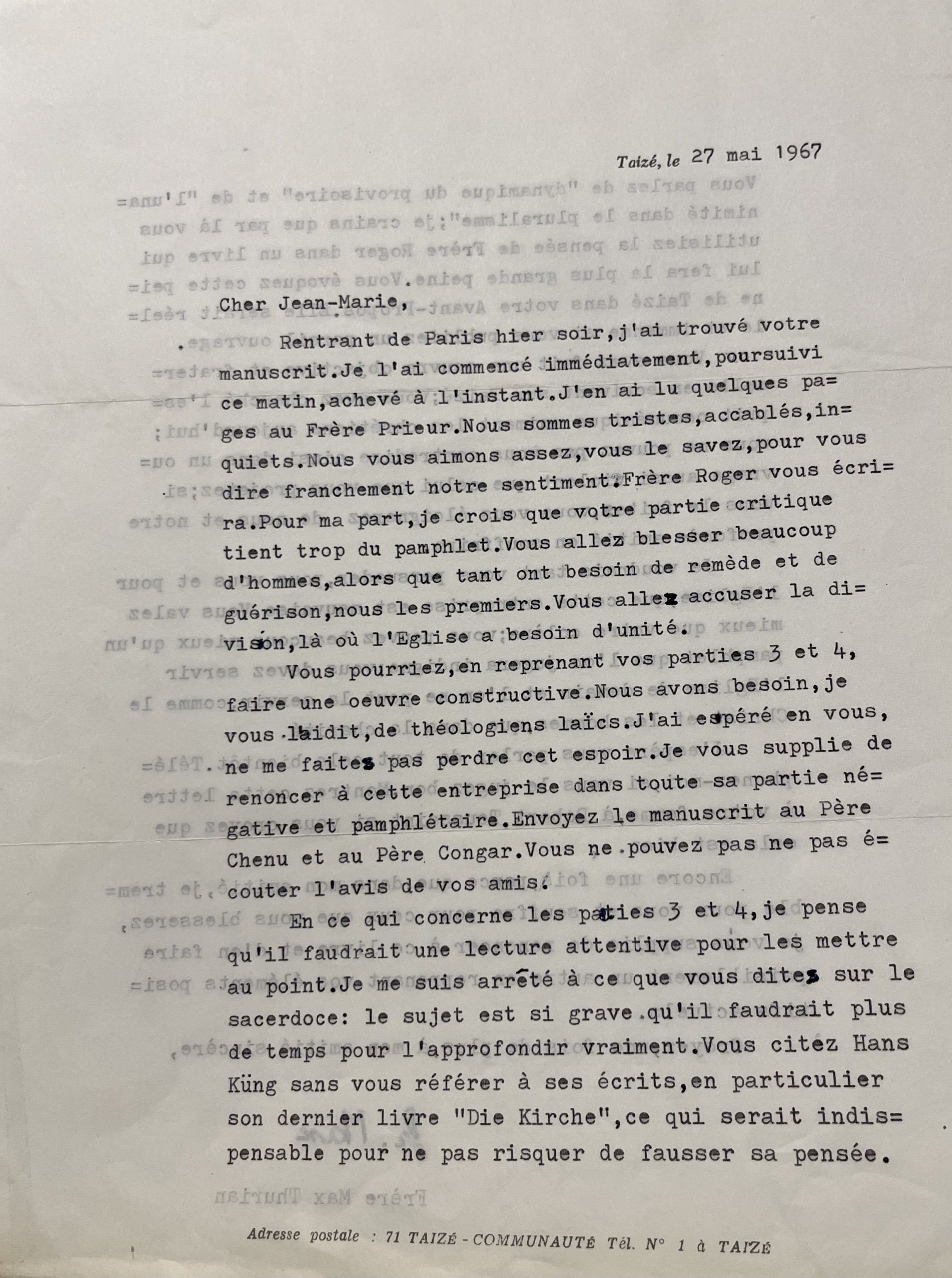 "Rentrant de Paris hier soir, j'ai trouvé votre manuscrit. Je l'ai commencé immédiatement, poursuivi ce matin, achevé à l'instant. J'en ai lu quelques passages au Frère Prieur. Nous sommes tristes, accablés, inquiets. Nous vous aimons assez, vous le savez, pour vous dire franchement notre sentiment. Frère Roger vous écrira [Roger Schutz, fondateur de la communauté de Taizé en 1944]. Pour ma part, je crois que votre partie critique tient trop du pamphlet. Vous allez blesser beaucoup d'hommes, alors que tant ont besoin de remède et de guérison, nous les premiers. Vous allez accuser la division, là où l'Eglise a besoin d'unité. Vous pourriez, en reprenant vos parties 3 et 4, faire une œuvre constructive. Nous avons besoin, je vous l'ai dit, de théologiens laïcs. J'ai espéré en vous, ne me faites pas perdre cet espoir. Je vous supplie de renoncer à cette entreprise dans toute sa partie négative et pamphlétaire. Envoyez le manuscrit au Père Chenu et au Père Congar. Vous ne pouvez pas ne pas écouter l'avis de vos amis. [...] Je me suis arrêté à ce que vous dites sur le sacerdoce : le sujet est si grave qu'il faudrait plus de temps pour l'approfondir vraiment. Vous citez Hans Küng sans vous référer à ses écrits, en particulier son dernier livre "Die Kirche", ce qui serait indispensable pour ne pas risquer de fausser sa pensée. Vous parlez de "dynamique du provisoire" et de "l'unanimité dans le pluralisme" ; je crains que par là vous utilisiez la pensée de Frère Roger dans un livre qui lui fera la plus grande peine. Vous évoquez cette peine de Taizé dans votre Avant-Propos. Elle serait réelle et immense si vous publiiez un pareil ouvrage. Vous avez fait une œuvre objective et fraternelle en écrivant sur Taizé ; vous avez cherché l'esprit œcuménique animant les chrétiens aujourd'hui ; vous ne pouvez pas vous contredire ainsi dans un ouvrage aussi violent que celui que vous projetez ; si vous le faites, vous vous éloignerez de nous et notre profonde amitié en souffrira. Je voudrais tant vous persuader, pour vous et pour l'Eglise, que cette entreprise est mauvaise. Vous valez mieux que votre colère [...]".