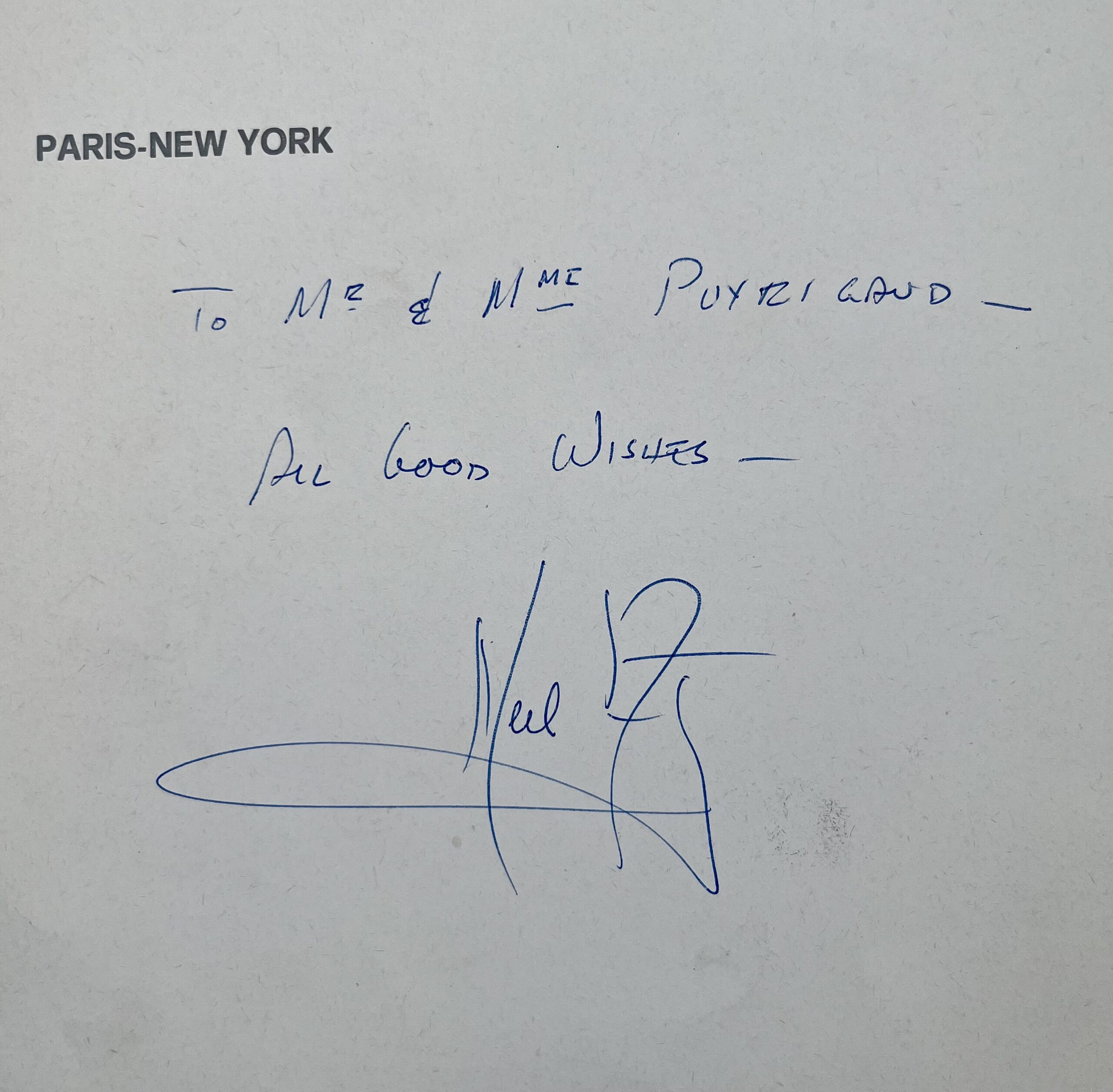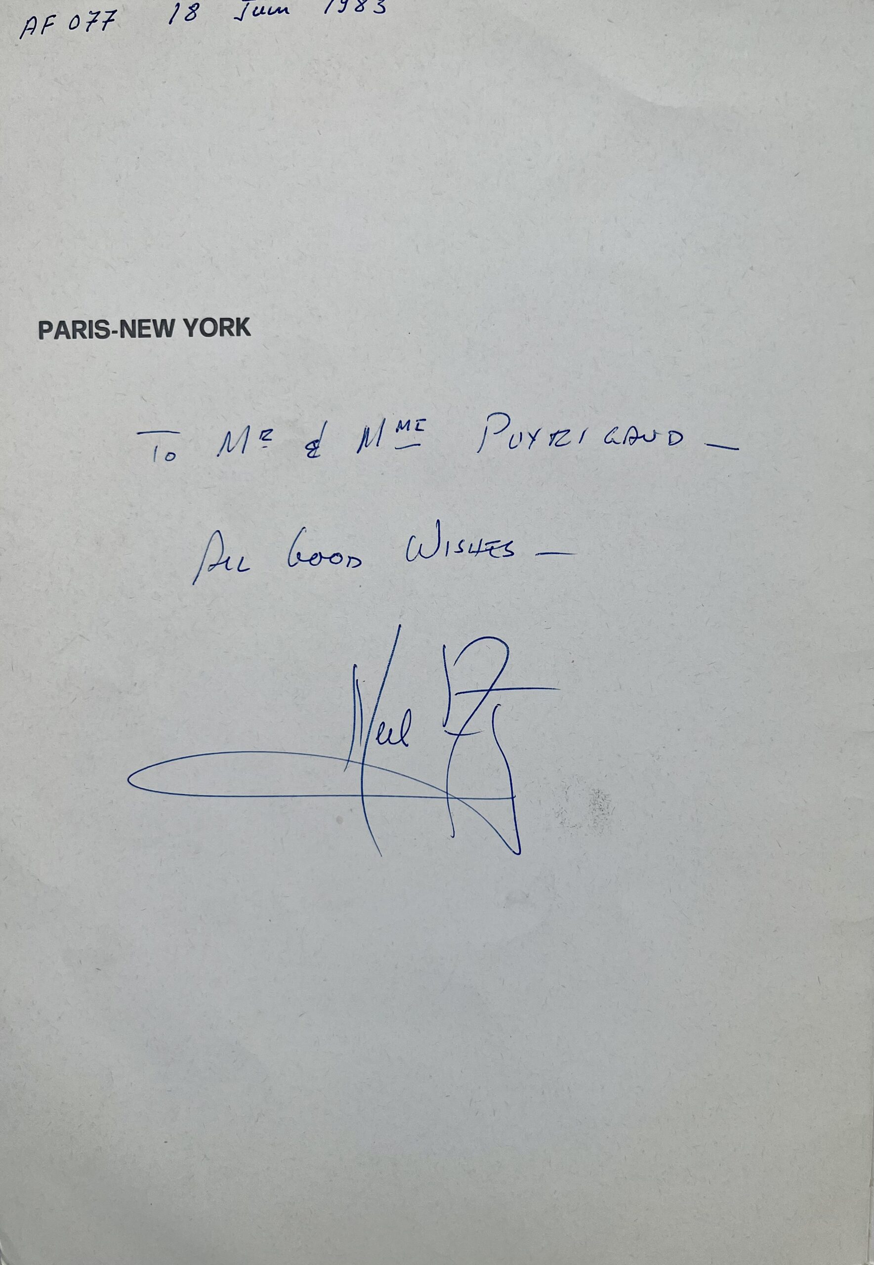 Menu dépliant d'Air France pour le vol Paris-New York (AF 077) du 18 juin 1983, portant un envoi autographe signé de Neil Armstrong "To Mr & Mme Puyrigaud. All good wishes. Neil Atg".