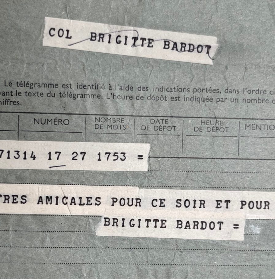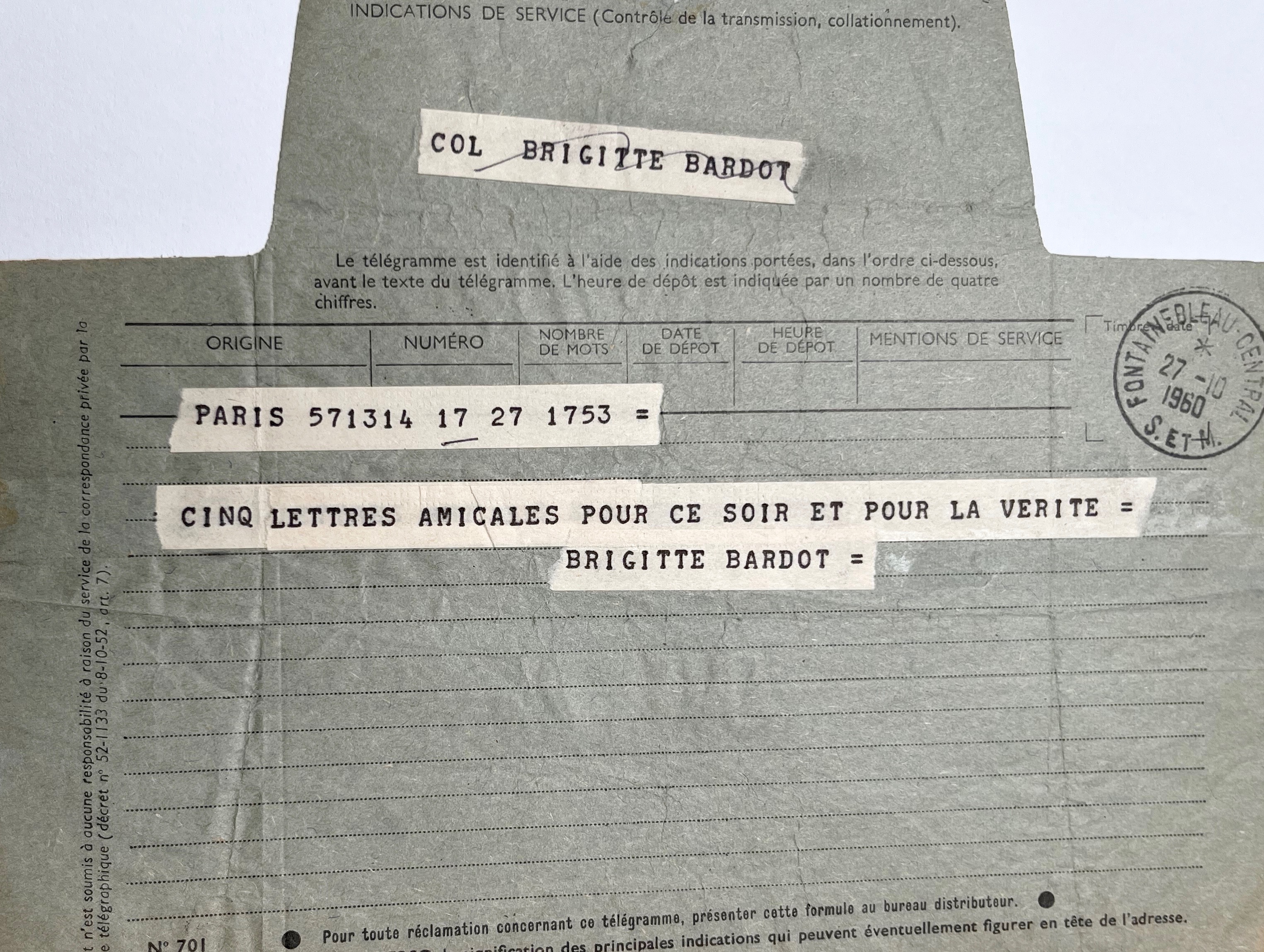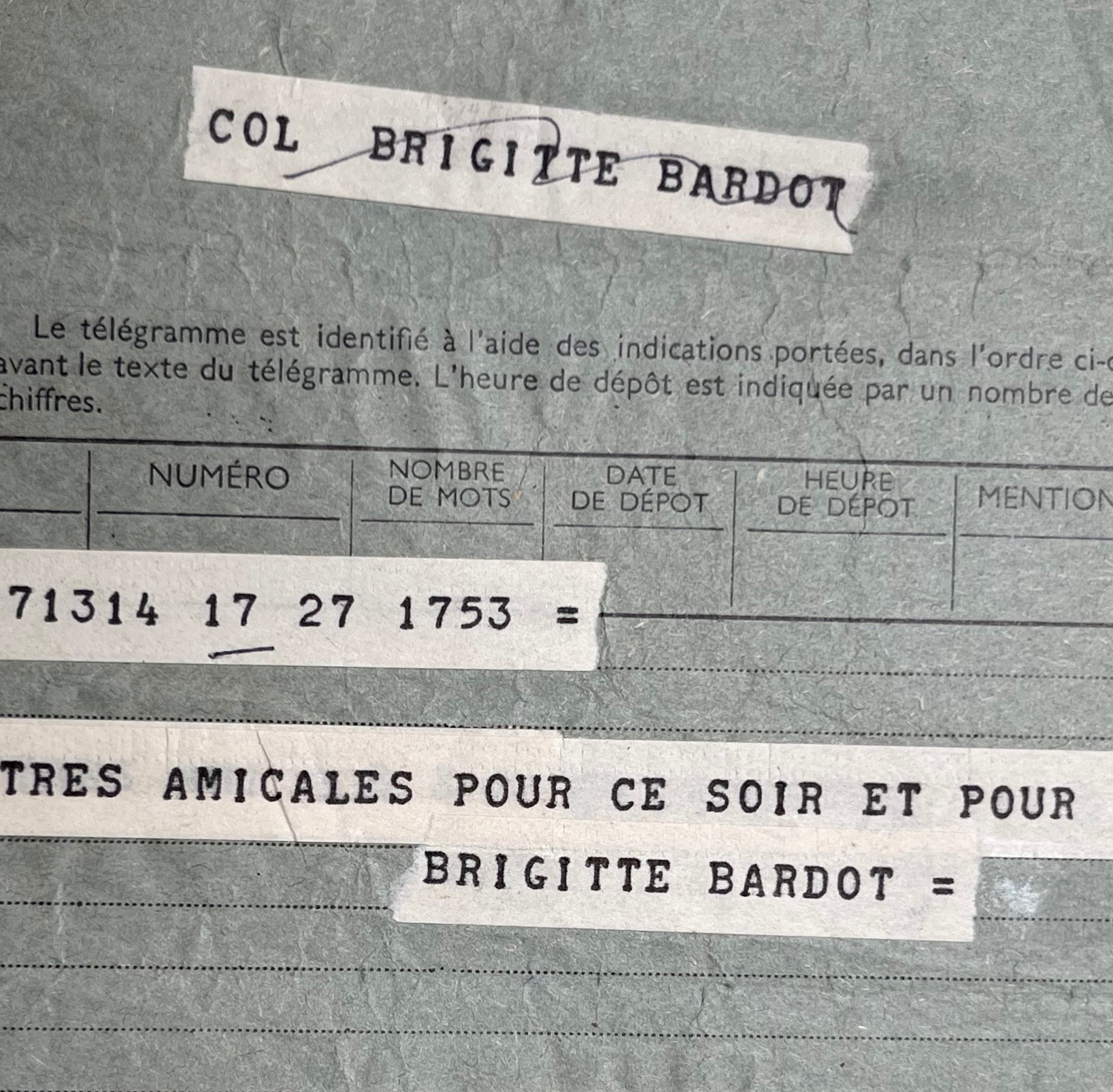 Télégramme de Brigitte Bardot, adressé à Paul Meurisse, pour l'avant-première de La Vérité, film d'Henri-Georges Clouzot dans lequel elle incarne le rôle principal aux côtés de Sami Frey et Paul Meurisse. Il sortira dans les salles, quelques jours plus tard, le 2 novembre 1960, et sera nommé pour l'Oscar du meilleur film en langue étrangère en 1961.