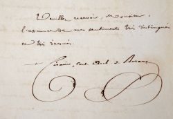 Césaire Mathieu (Paris, 1796/1875)Lettres sur le Saint-Suaire de Besançon qui fut détruit à la Révolution. "J'ai reçu une lettre fort obligeante du directeur des archives du corps législatif, lequel me dit qu'il vous verra volontiers au sujet du Saint Suaire. Je vous prie donc d'aller le voir et de causer avec lui de cette importante affaire, comme aussi de repasser les lieux où la relique aurait pu être envoyée et surtout ce qui concerne le procès-verbal qui ne contient pas le rapport inséré au Moniteur. S'il vous venait à l'esprit d'autres suppositions ou combinaisons, je vous serais obligé d'en conférer avec M. l'archiviste et de m'en rendre compte [...]. Je fais bien des voeux pour que vous puissiez passer à la section de législation et continuer les recherches si importantes pour nous. Je vous remercie de la lettre délirante de nos administrateurs du Directoire de Besançon que vous m'avez envoyée et qui est frappée de l'affreux cachet du temps [...]".