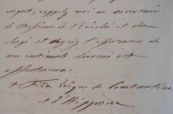 Mgr de Las Cases adresse ses dernières lettres pastorales à son correspondant en remerciement de la générosité dont il a fait preuve pour son oeuvre. «Partout l'oeuvre prend admirablement». Il a trouvé en Algérie beaucoup de soutiens et «un tel dévouement!». «Déposez aux pieds de monseigneur l'hommage de mon profond respect [...]».
