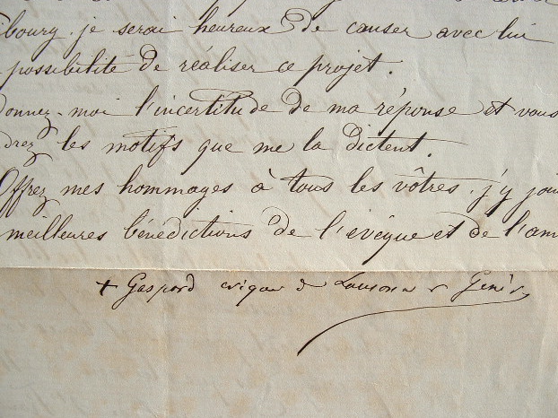 Gaspard Mermillod (Carouge, 1824/1892)L'évêque de Lausanne et Genève, Gaspard Mermillod, répond à la question délicate du mariage mixte. «Les mariages mixtes offrent toujours de grands périls. Tant de questions divisent les coeurs qu'il importe de se rencontrer au moins dans l'unité des convictions religieuses. Toutefois l'Eglise les tolère à certaines conditions. Aussi nous les acceptons lorsque ces conditions sont promises et tenues exactement. Je comprends que le nom de monsieur de Foras, allié au grand souvenir de St François de Sales et de monsieur de Maistre, paraisse un obstacle à une semblable union. Je n'ose donc le blâmer de son hésitation. Peut-être qu'après un entretien avec lui, examinant les avantages sérieux de sa fille, je pourrai acquiescer à votre projet [...]». Il invite M. de Foras à venir le voir pour en discuter.