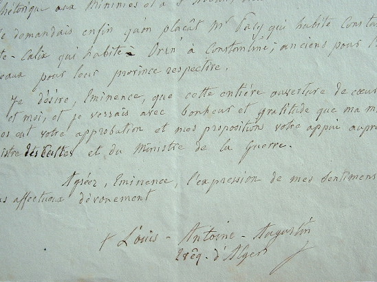 Louis Antoine Augustin Pavy (Roanne, 1805/1866)Au moment où les autorités impériales doivent ratifier la création des évêchés d'Oran et de Constantine, Mgr Pavy, évêque d'Alger, tente d'imposer ses choix pour la nomination des évêques, même s'il doit aller contre l'Empereur qui avait souhaité des hommes nouveaux pour occuper ces postes. Il rappelle l'argumentaire développé, en trois points, au ministre des Cultes, dans lequel il développe sa perception de l'Eglise algérienne, pour imposer les différents hommes qu'il propose. «J'exposais la nécessité de fonder sur l'unité une Eglise où l'esprit provincial n'entretenait déjà que trop de pelouses concurrentes ; je rappelais le péril de voir entamer par des innovations une discipline que vingt ans d'efforts n'avaient que faiblement enracinée dans un clergé aussi hétérogène que le mien, l'état de subordination forcée où se trouveraient les évêques privés de séminaires pendant longtemps et dont les propositions budgétaires pour créations nouvelles seraient forcément soumises à mon contrôle, tous les prêtres élevés, ordonnés et appelés en retraite à Alger, les relations épiscopales aboutissant à Alger pour la moindre demande par suite de la concentration des pouvoirs aux mains du gouverneur-général, etc., choses faciles pour les vicaires généraux habitués depuis de longues années à ce régime exceptionnel et plus que difficile à des arrivants, ne sachant rien à cette situation délicate [...]». Il passe en revue les différentes personnes qu'il suggère. [Aucune de ses propositions ne sera finalement retenue].