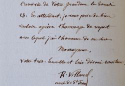 Lettre de Raymond Villard, futur évêque d'Autun (il sera nommé à ce poste quelques jours plus tard, le 13 juillet 1906), alors curé de Saint-Jean de Langres. "J'ai l'honneur de rappeler à Votre Grandeur la promesse qu'elle a bien voulu faire à monseigneur Herscher [évêque de Langres] de venir à notre grande fête du Grand Pardon, le 24 juin prochain. La joie a été vive parmi nos jeunes gens à cette nouvelle. Ils pensent vous demander d'accepter la présidence du concours de gymnastique qui aura lieu le 25 [...]".