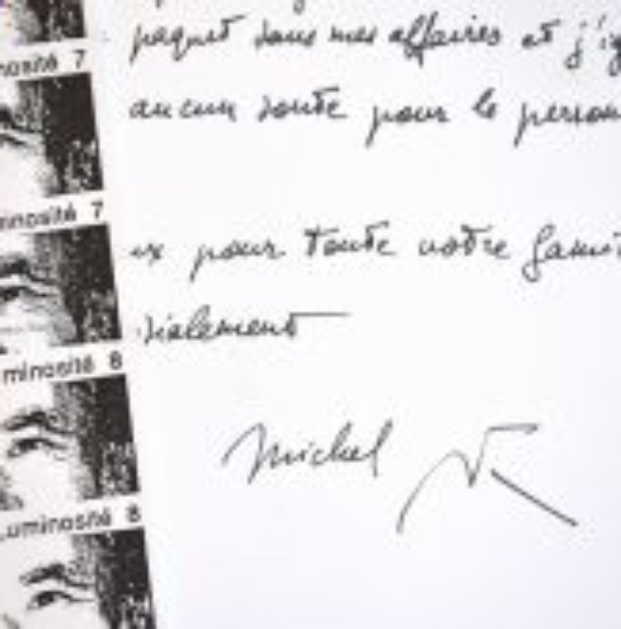 Au dos d'une carte-montage le représentant avec un poème au dessous "à la croisée des chemins" (imprimé), Michel Butor écrit ce commentaire : "Je ne sais si le personnage sur cette bande est bien moi. J'en ai retrouvé un paquet dans mes affaires et j'ignore d'où il vient. Par contre aucun doute pour le personnage qui est au dessous". La bande en question est jointe : il s'agit d'une série d'essais d'impression d'un visage tronqué.
