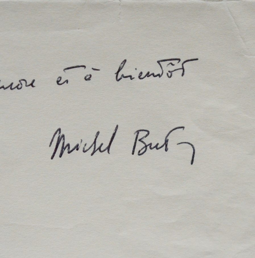Michel Butor remercie Madeleine Chapsal de lui avoir envoyé un texte et ajoute "[...] J'y ai apporté quelques corrections de détail. Je crois qu'il vaudrait mieux supprimer le passage où il est question de Françoise Sagan [...]". Il annonce son départ pour la Grèce et précise la date de parution du "Génie du lieu" : ce sera durant les premiers jours de mai.