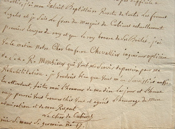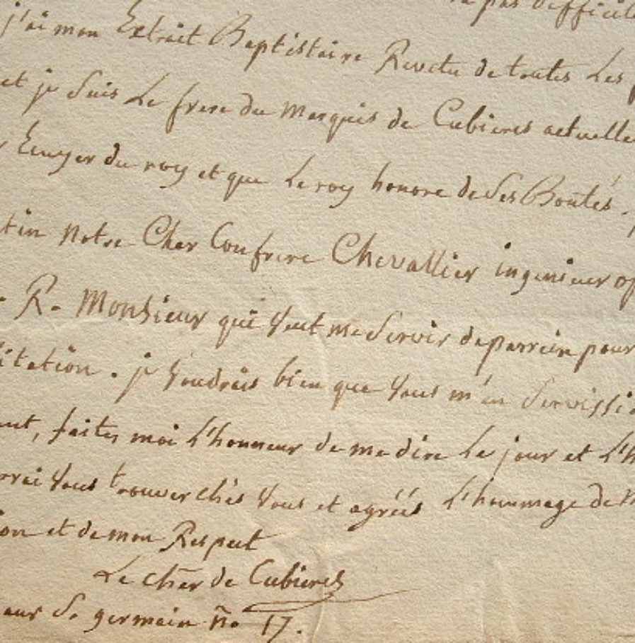 Michel Cubières (chevalier de) (Roquemaure, 1752/1820)«J'ai été reçu chevalier dans l'ordre du Saint-Sépulchre, le 21 janvier 1776, vous l'avez été la même année le 14 juillet. Je suis votre doyen par la date de ma réception, mais vous êtes le mien par vos vertus et vos talents auxquels tout le monde rend justice [...]». Ayant loué tour à tour tous les régimes, Cubières applaudit cette fois au retour des Bourbons et souhaite être réhabilité «dans mes titres et honneurs». A cette effet, il indique les renseignements nécessaires. «J'ai vu ce matin notre cher confrère Chevallier, ingénieur opticien de S.A.R. Monsieur qui veut me servir de parrain pour ma réhabilitation. Je voudrais bien que vous m'en servissiez aussi [...]».