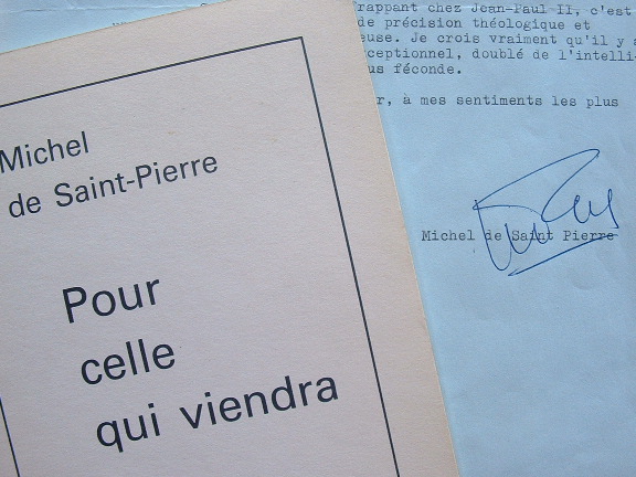 Michel de Saint-Pierre (Blois, 1916/1987)Michel de Saint-Pierre se place dans la droite ligne de son correspondant au sujet de Léopold Sédar Senghor [leur admiration était réciproque] ; il évoque ensuite Jean-Paul II et ses poèmes. "En ce qui concerne les écrits et les poèmes du Pape Jean-Paul II, je ne peux pas les situer dans une lignée précise. Je ne connais d'ailleurs pas plus que vous la littérature polonaise. Il est trop clair qu'il faudrait lire ces textes dans la langue originale... Ce qui me semble frappant chez Jean-Paul II, c'est un mélange extrêmement rare de précision théologique et d'inspiration lyrique religieuse. Je crois vraiment qu'il y a chez cet homme un charisme exceptionnel, doublé de l'intelligence la plus active et la plus féconde [...]». Avec une brochure dédicacée, Pour celle qui viendra (in-8, 1981).