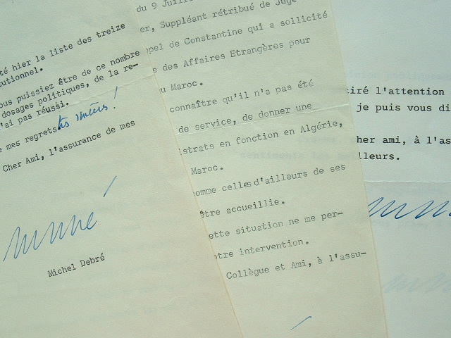 Michel Debré (Paris, 1912/1996)Quatre lettres de Michel Debré sur différentes affaires. Dans une première (juillet 1958), il annonce à Debû-Bridel qu'il n'a pas réussi à l'imposer au Comité constitutionnel : «Le Gouvernement a arrêté hier la liste des treize membres du Comité Consultatif Constitutionnel. J'aurais voulu que vous puissiez être de ce nombre mais vous imaginez le problème des dosages politiques, de la représentation professionnelle. Je n'ai pas réussi. Je vous en exprime mes regrets bien sincères [...]». Une autre concerne la mutation refusée d'un juge de Constantine. Une troisième est très brève : «J'ai attiré l'attention du gouvernement, c'est tout ce que je puis vous dire». Dans une dernière missive, il refuse de participer à toute manifestation collective : «J'ai donné mon opinion publiquement - et par écrit. Et, à l'occasion, je la redirai fortement, car l'affaire n'est pas terminée [...]».