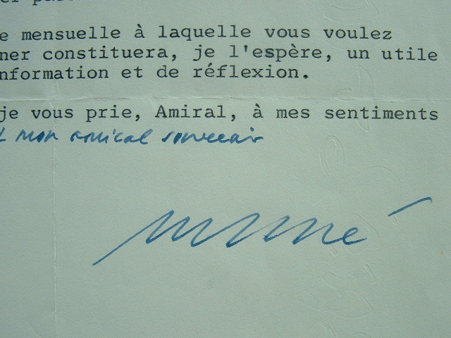 Michel Debré remercie Sanguinetti de l'intérêt qu'il porte à son activité politique, ce qui constitue pour lui un encouragement. «La France traverse une grave crise économique, sociale et politique. Elle est minée de l'intérieur par des forces agressives. Elle est diminuée aux yeux de l'étranger. Ceux qui croient encore en notre pays ne peuvent demeurer passif [...]».