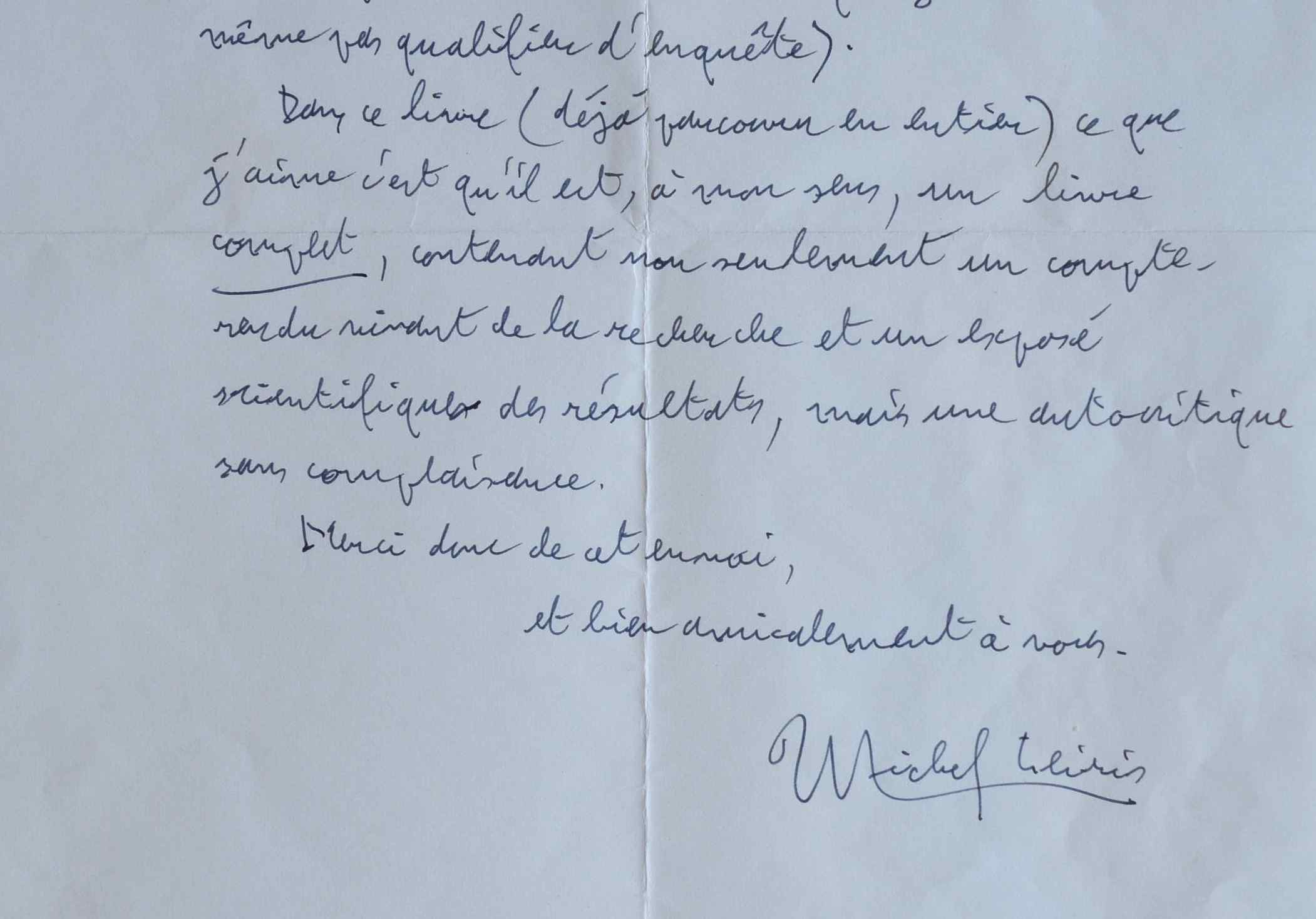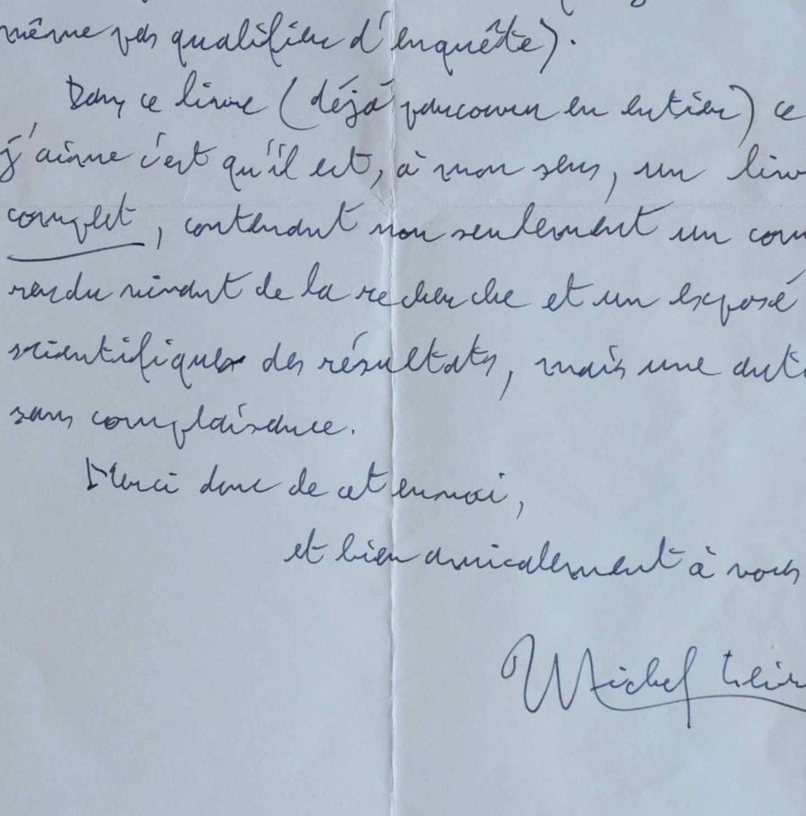 Michel Leiris (Paris, 1901/1990)Après la lecture du dernier ouvrage de l'éthnologue Jean-Marie Gillab [Tambours d'eau : journal et enquête sur un culte de possession au Mali occidental]. «Je lis avec sympathie et intérêt votre livre consacré à ces Siné-Dou que j'ai, quant à moi, à peine effleurés (assistant un 14 juillet à Kita à une danse de dyedunu, puis posant à ce sujet quelques questions au cours de ce que je n'oserai même pas qualifier d'enquête). Dans ce livre (déjà parcouru en entier), ce que j'aime c'est qu'il est, à mon sens, un livre complet, contenant non seulement un compte-rendu vivant de la recherche et un exposé scientifique des résultats, mais une autocritique sans complaisance [...]».