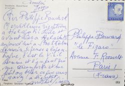 Carte de Michel Simon écrite d'Helsinki durant sa tournée en Scandinavie où on lui a réservé une "merveilleuse réception". Il va se rendre à Stockholm puis à Copenhague. "C'est le Vieil homme et l'enfant qui me réconforte et me fait oublier ce que vous savez!". La carte est également signée par sa compagne, Josy Guoillandeau. [Le Vieil homme et l'enfant, film semi-autobiographique de Claude Berri, est sorti au printemps 1967].