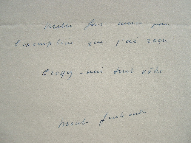 «Mille fois merci pour l'exemplaire que j'ai reçu. Croyez-moi tout vôtre. Marcel Jouhandeau».