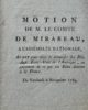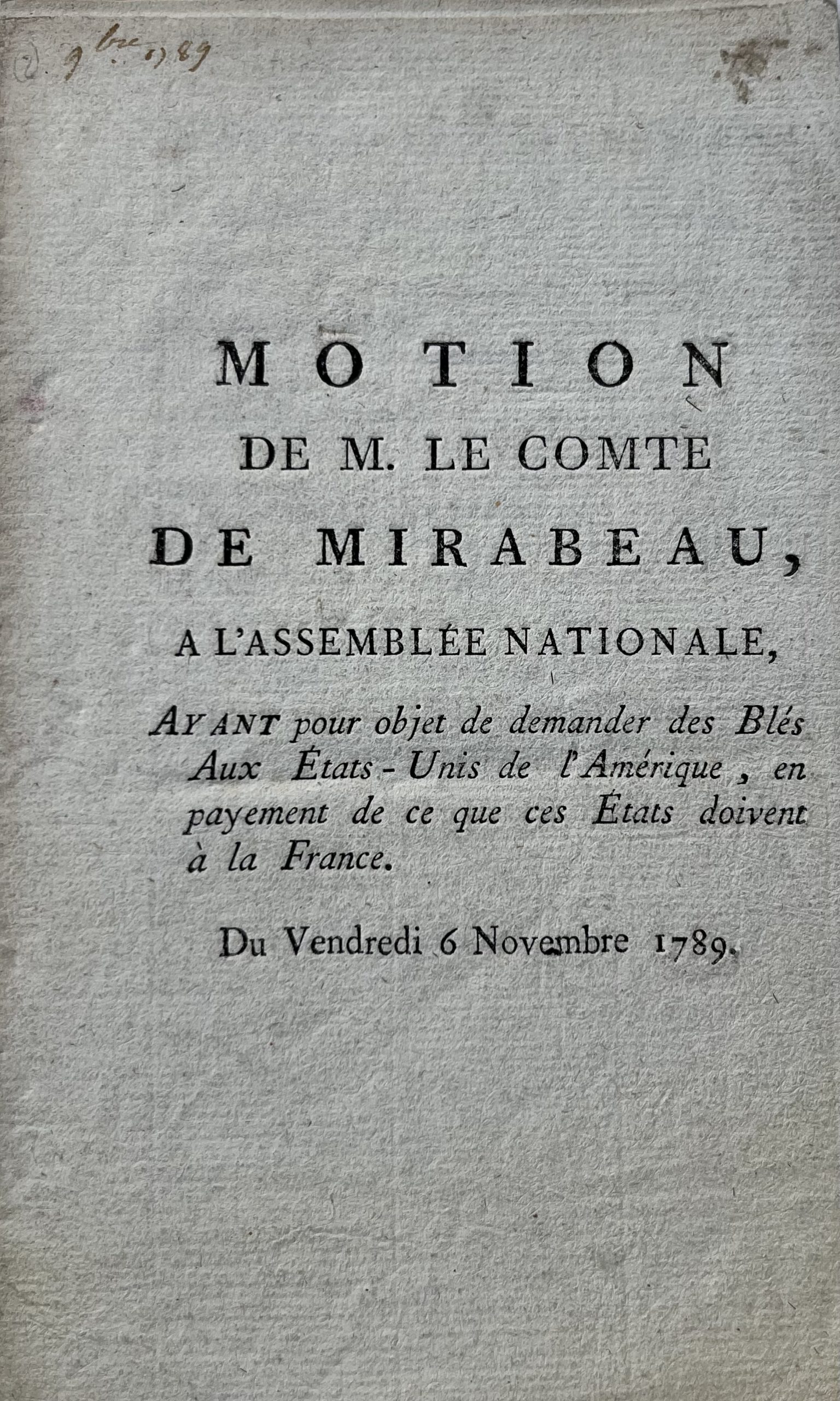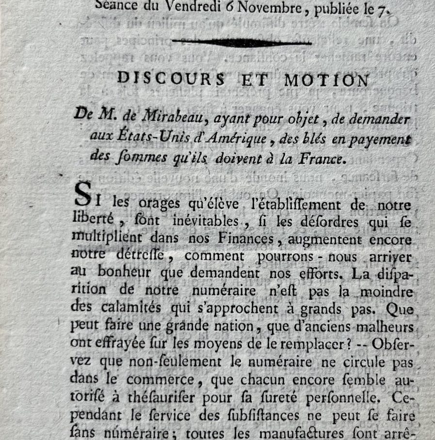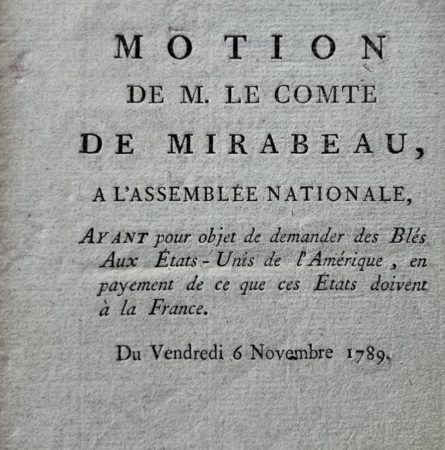 Rare petite brochure intitulée : "Motion de M. le Comte de Mirabeau, à l'Assemblée nationale, ayant pour objet de demander des blés aux États-Unis de l'Amérique, en payement de ce que ces États doivent à la France. Du Vendredi 6 novembre 1789".