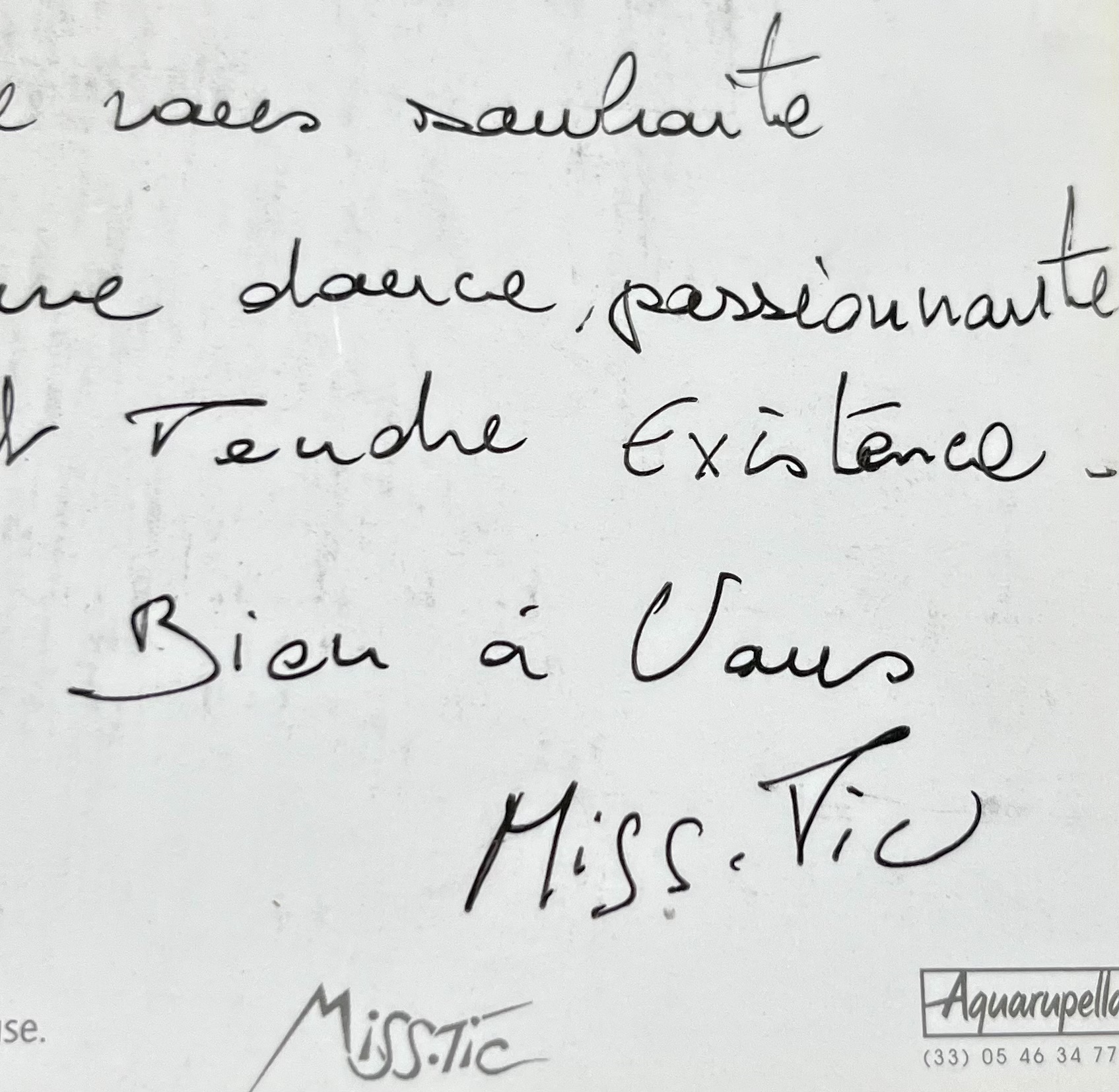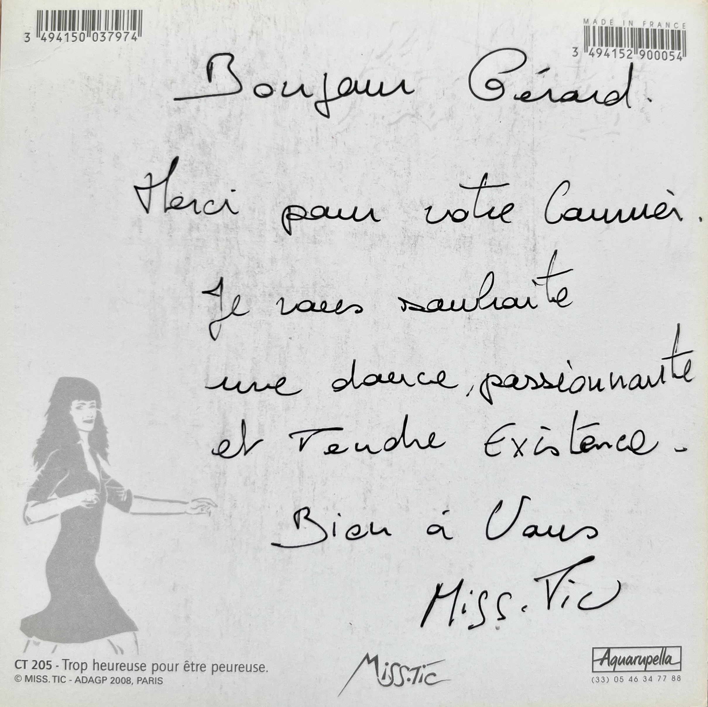 "Bonjour Gérard. Merci pour votre courrier. Je vous souhaite une douce, passionnante et tendre existence. Bien à vous. Miss Tic".