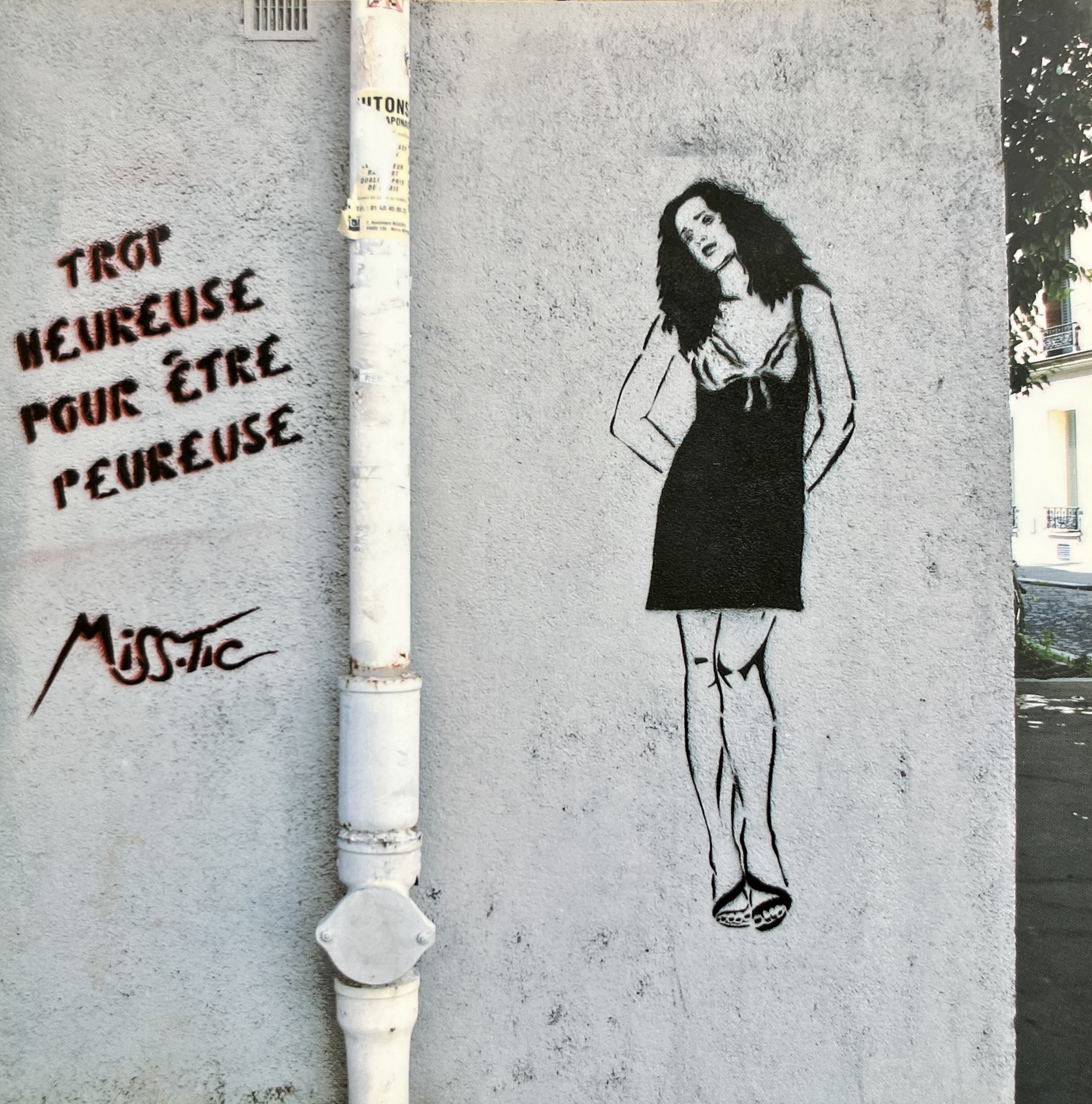 Elle est écrite au dos d'une carte reproduisant un pochoir de l'artiste, la figurant debout avec ce slogan : "Trop heureuse pour être peureuse. Miss. Tic".