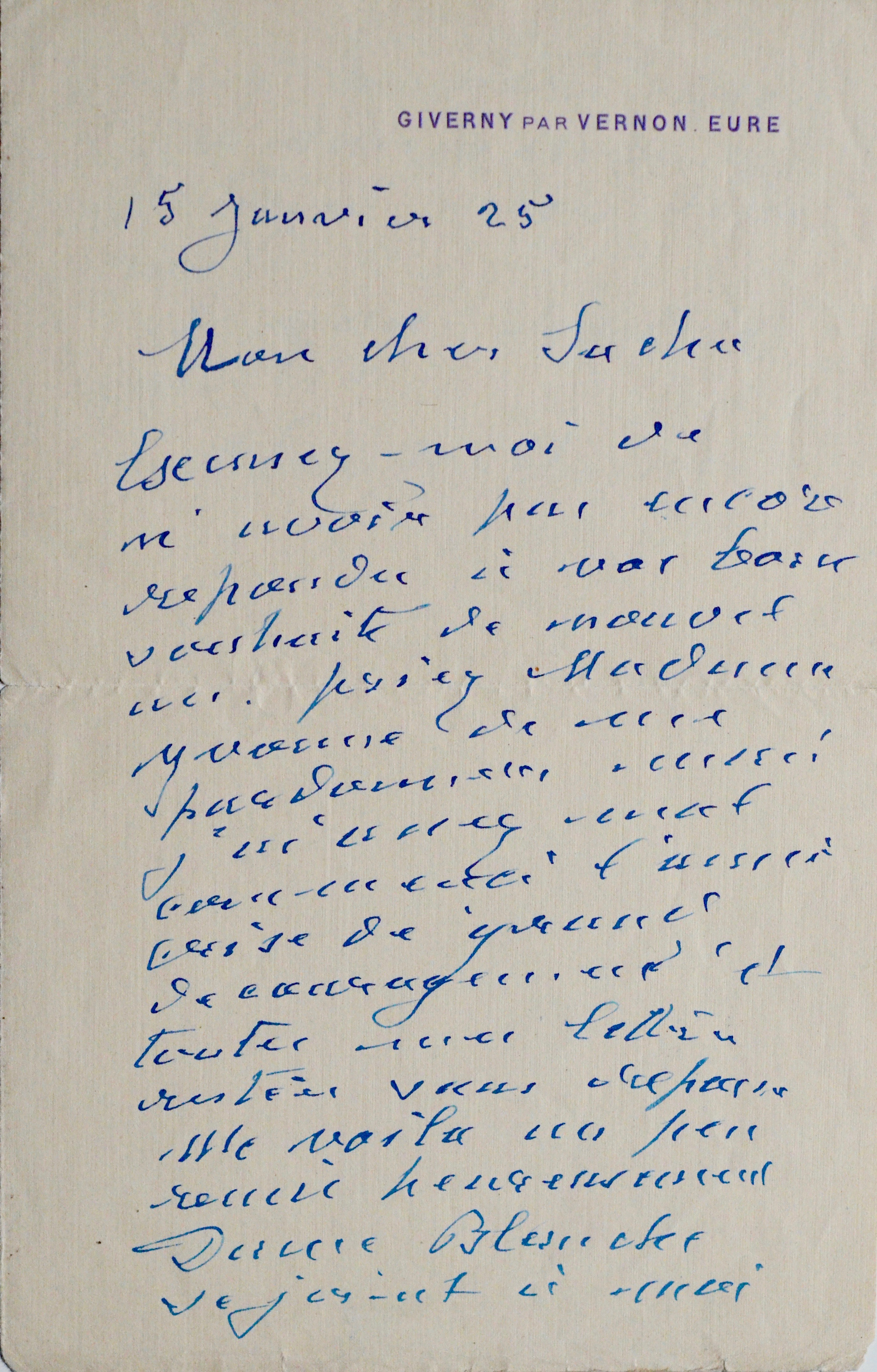 Claude Monet, âgé et abattu, écrit à son ami Sacha Guitry pour s'excuser de ne pas avoir répondu à ses bons souhaits de nouvel an. Il ajoute "Priez Madame Yvonne [Printemps] de me pardonner aussi. J'ai assez mal commencé l'année, crise de grand découragement et toutes mes lettres restent sans réponse. Me voilà un peu remis heureusement. Dame Blanche [Hoschedé] se joint à moi pour notre meilleur souvenir et tous nos souhaits. À vous de vieille amitié. Claude Monet".