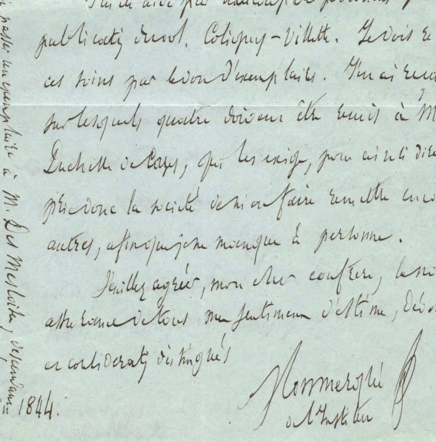 Louis Monmerqué (Paris, 1780/1860)Deux lettres relatives à la publication des Mémoires de Coligny et de Villette, sous l'égide de la Société de l'Histoire de France, d'après des manuscrits originaux. Monmerqué s'est fait prêter ou vendre de nombreux manuscrits originaux par des particuliers ou des institutions, et se bat pour, qu'en retour, il leur soit délivré des exemplaires. «Je crois qu'il convient de donner un exemplaire à la Bibliothèque de la Marine, et de mon côté je vais y déposer et lui donner le mss en partie autographe de Villette. Je ne puis me dispenser d'en offrir un à M. Ferdinand Denis qui s'est donné beaucoup de peine pour rétablir le texte altéré d'une lettre espag. qui se trouve à la page 231 [...]. Je pense qu'il serait très convenable d'adresser à M. Desmeloises, à Issoudun, un exemplaire du volume. Il possède le mss autographe de Coligny et la correspondance du comte avec Louis XIV. J'adresse une prière à ce descendant de Coligny à la fin de la notice sur Villette, page 44, et j'en espère une importante communication. J'espère faire des Mémoires de Coligny une 2e édition, et je m'occupe à la faire avec et pour la Société de l'Histoire de France. Il faut qu'elle me vienne en aide pour obtenir ces documents [...]». Dans une seconde lettre, il s'insurge du fait que la Société de l'Histoire de France refuse de lui rembourser ses frais. «J'ai été heureux d'offrir à la société des manuscrits inédits, dont la plus grande partie m'appartenait ; j'ai eu du plaisir à les mettre en lumière, mais je n'ai jamais entendu mettre à ma charge les frais que leur publication rendait indispensables [...]». Il explique ce qu'il lui en a coûté. Il est joint un brouillon de réponse de Duchesne (1 p. 1/2 in-8).