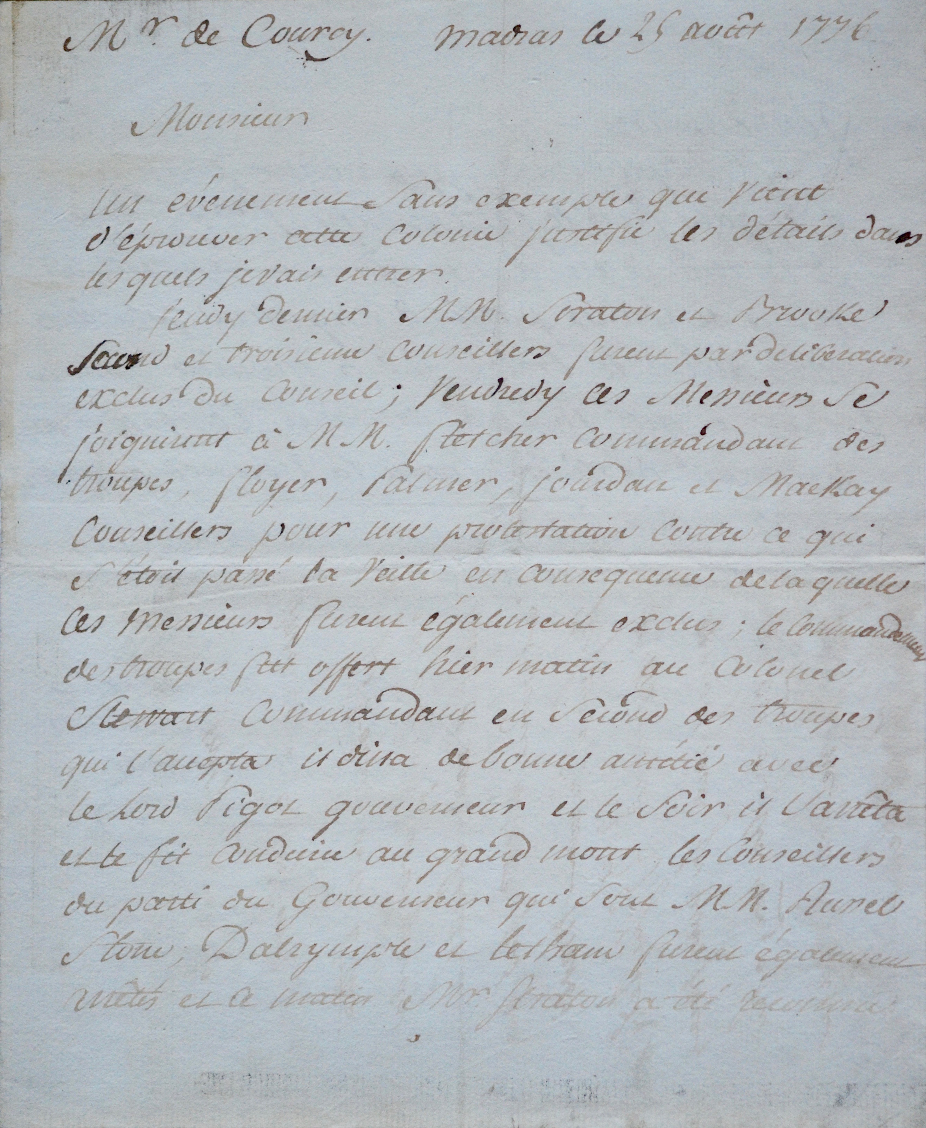 "[...] Un évènement sans exemple qui vient d'éprouver cette colonie justifie les détails dans lesquels je vais entrer. Jeudy dernier, MM. Straton et Brooke, second et troisième conseillers furent par délibération exclus du conseil. Vendredy ces Messieurs se joignirent à MM. Flechter commandant des troupes Floyer [Charles Floyer fils de l'ancien gouverneur de Madras, William Dalrymple, dont il est question plus bas], Palmer, Jourdan et MacKay Conseillers pour une protestation contre ce qui s'étois passé la veille en conséquence de laquelle ces messieurs furent également exclus. Le commandement des troupes fut offert hier matin au colonel Stewart commandant en second des troupes qui l'accepta. Il dina de bonne amitié avec île Lors Pigot gouverneur [...]".