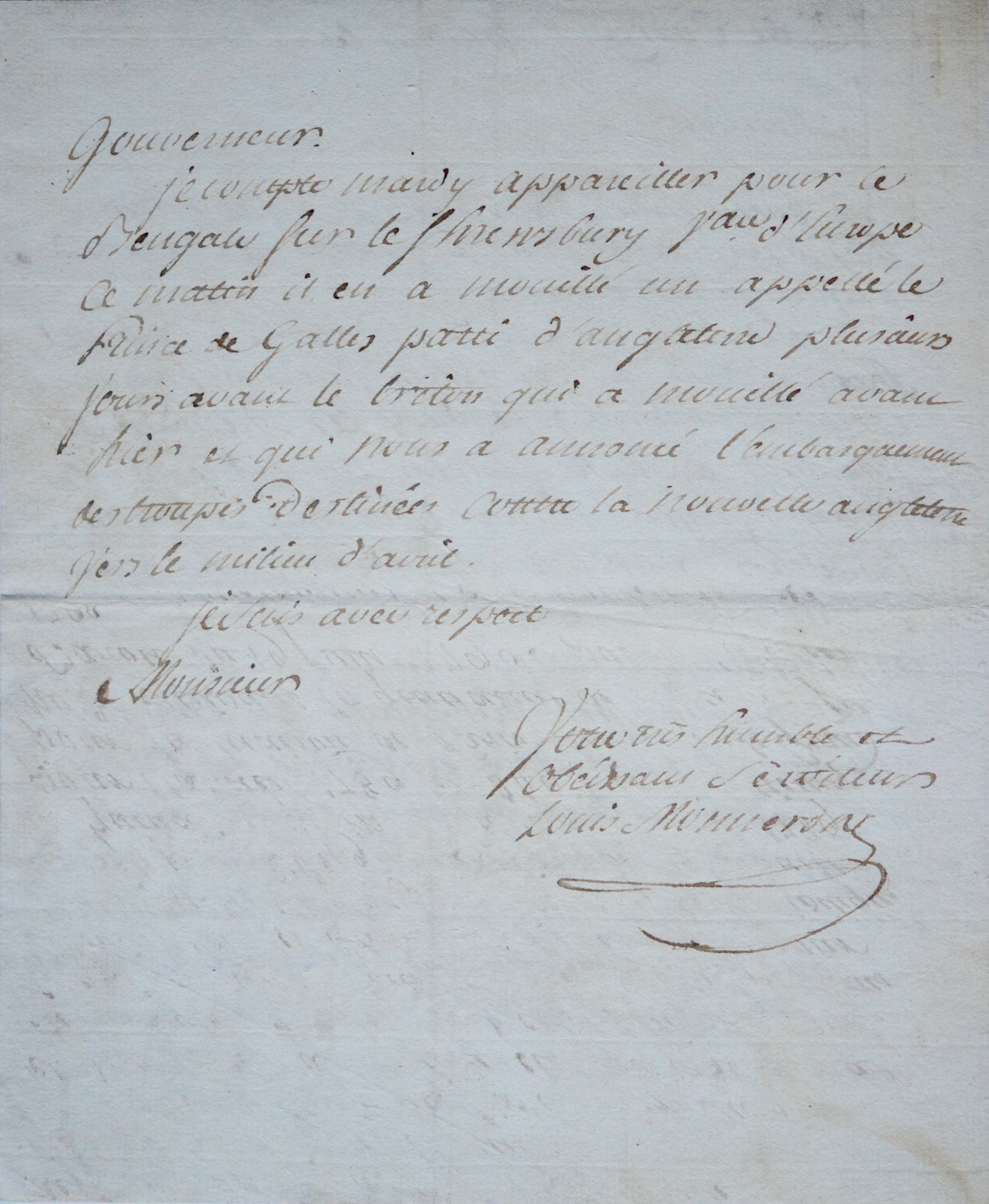 Monneron compte appareiller pour le Bengale sur le Shewsbury. Parmi les autres vaisseaux ayant mouillés à Madras, il y en a "un appellé le Prince de Galle parti d'Angleterre plusieurs jours avant le Triton qui a mouillé avant hier et qui nous a annoncé l'embarquement des troupes destinées contre la nouvelle Angleterre vers le milieu d'avril [...].