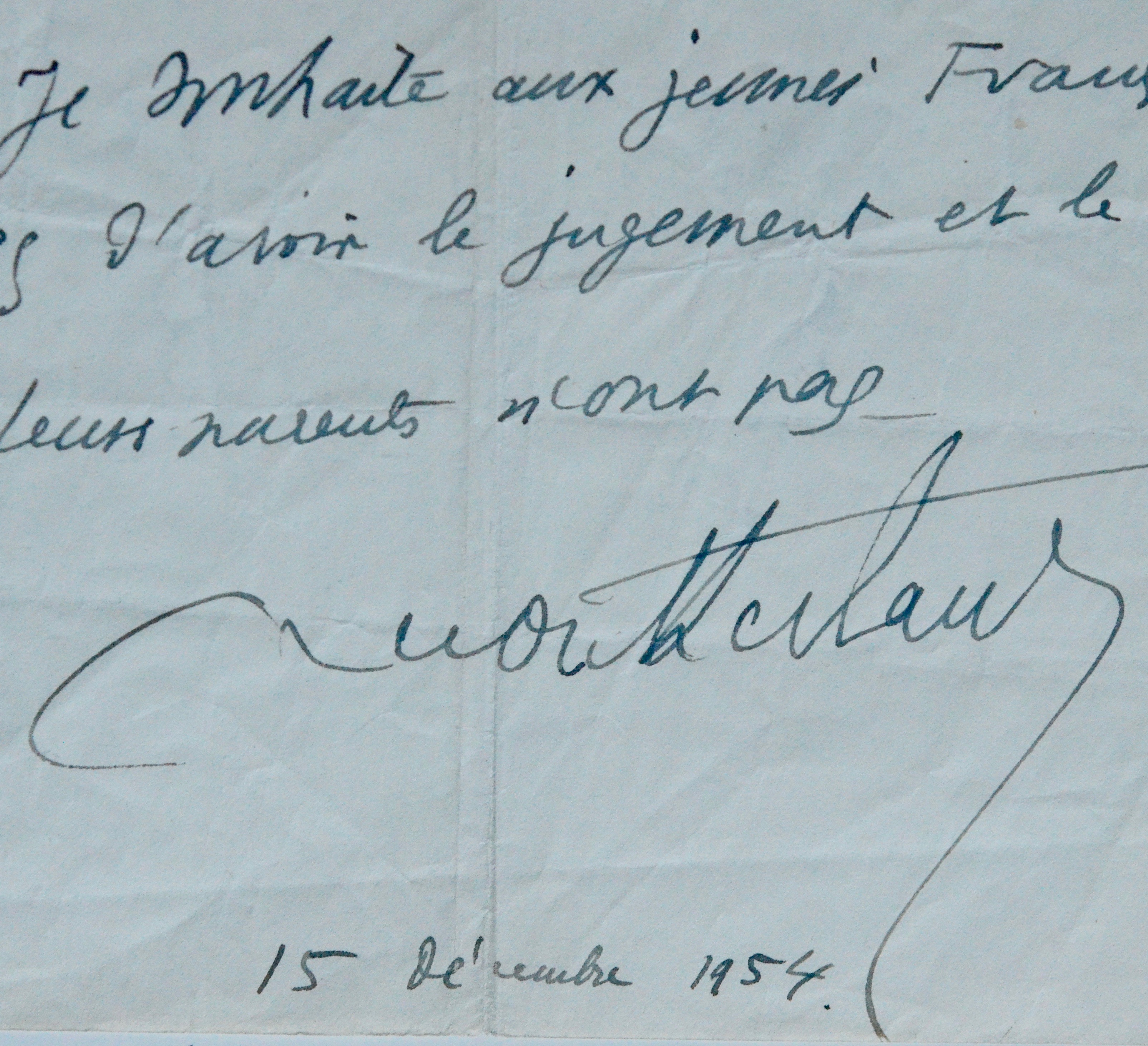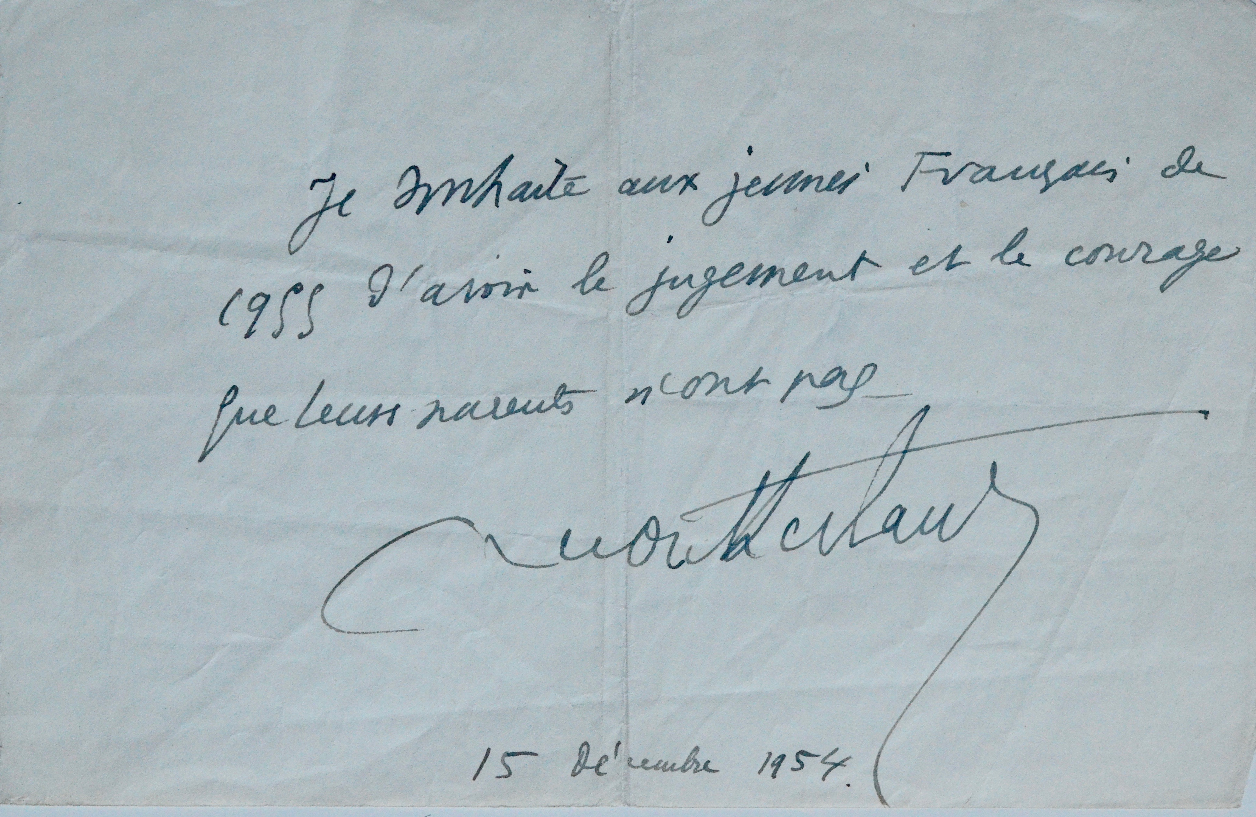 Bel aphorisme patriotique d'Henry de Montherlant : "Je souhaite aux jeunes Français de 1955 d'avoir le jugement et le courage que leurs parents n'ont pas". Belle signature.