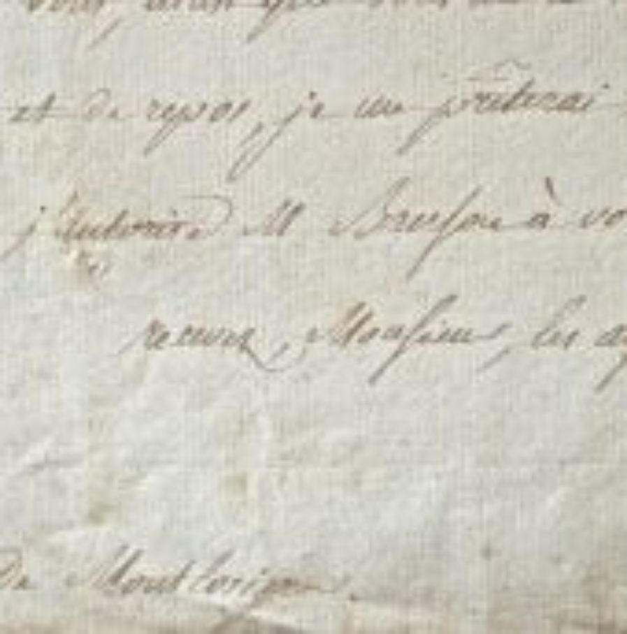 [Le comte de Montlosier, à la demande du Premier Consul, avait entrepris une oeuvre destinée à fournir des arguments historiques à la réconciliation nationale et à la fusion des élites mais l'Empereur lui en interdit finalement la publication]. De Finkestein, où Napoléon séjourna d'avril à juin 1807 et où, quelques jours plus tôt, le 4 mai, fut signé le traité entre Napoléon et la Perse, Montlosier reçoit cette lettre non signée. "Vous pensez avec raison que la nature et l'importance des événements qui occupent aujourd'hui l'attention générale pourraient empêcher qu'elle ne se portât sur un ouvrage destiné à offrir des développements d'une autre nature. D'autres temps seront plus favorables à la publication de ce travail et Sa Majesté approuve qu'elle soit suspendue. Vous pouvez, en attendant, Monsieur, suivre les projets de voyage que vous aviez formés. Que ce soit pour vous, ainsi que vous me le dites, un objet d'instruction ou de dissipation et de repos, je me prêterai avec plaisir à ce que vous désirez et j'autorise M. Bresson à vous donner pour ce voyage quelques facilités".