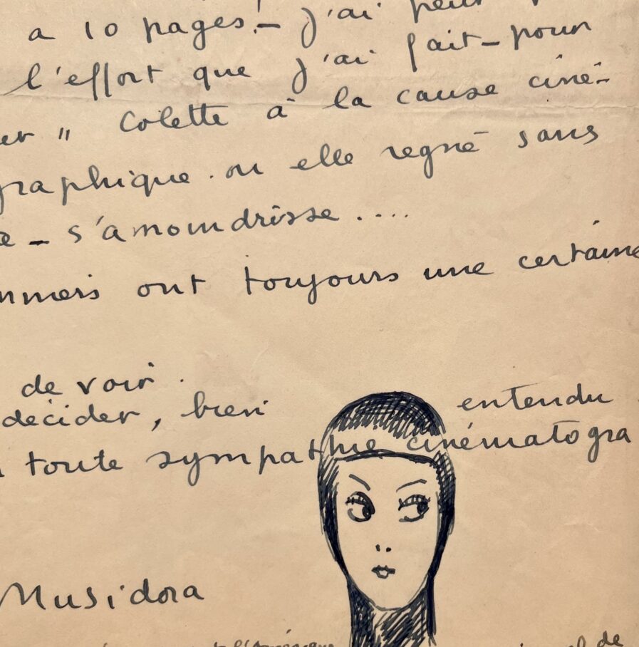 Musidora agrémente sa lettre d'un joli autoportrait à la plume, son visage coiffé de son célèbre costume d'Irma Vep : une combinaison noire moulante recouvrant ses cheveux et ajoute cette légende : "Dessin original de Musidora p. M. Barlatier".