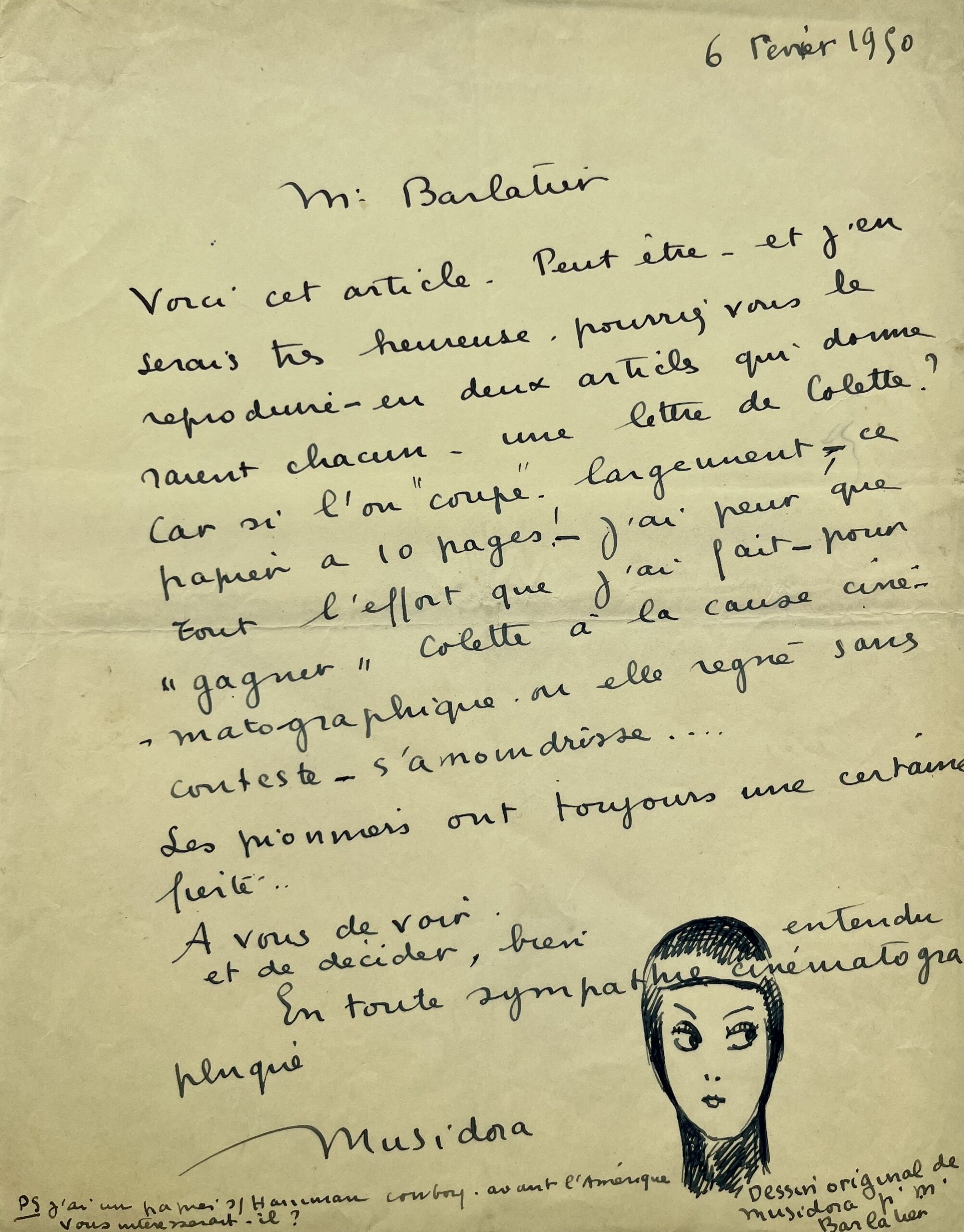 Musidora (Paris, 1889/1957)"M. Barlatier. Voici cet article. Peut-être - et j'en serais très heureuse, pourriez-vous le reproduire en deux articles qui donneraient chacun - une lettre de Colette ? Car si l'on "coupe" - largement - ce papier à 10 pages ! J'ai peur que tout l'effort que j'ai fait - pour "gagner" Colette à la cause cinématographique où elle (règne?) sans conteste - s'amoindrisse.... Les pionniers ont toujours une certaine fierté.. A vous de voir et de décider, bien entendu. En toute sympathie cinématographique. Musidora".