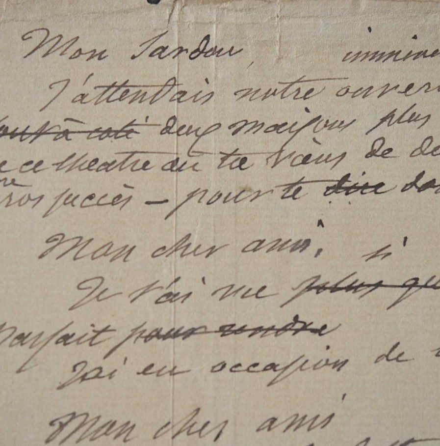 Félix Tournachon Nadar (Paris, 1820/1910)Brouillon d'une lettre de Nadar (signée "N") recommandant son ami peintre, Bourgoin, dont il lui fait suivre sa lettre. "Tu sauras la lire en ta qualité d'hypercacographe, mais si tu ne pouvais pourtant déchiffrer le nom du signataire, et si tu as oublié ce nom, il s'agit du peintre Bourgoin, un aquarelliste de premier ordre, merveilleux dans les intérieurs qu'il a peints chez Sarah [Bernhardt], Detaille, etc. Il est même d'une délicatesse et d'une élévation de sentiments que les générations qui nous suivent ne connaissent plus, me dit-on. En même temps qu'il est le plus désintéressé, le plus généreux des hommes, ce grand seigneur est aussi le plus pauvre et jamais tu n'auras eu l'occasion d'être utile, si tu le peux, à un plus galant homme [...]. Et quand tu passeras par notre Marseille, rappelle toi que tu me chagrinerais fort en omettant d'entrer dans la boutique que j'ouvre (enfin!...) sous une huitaine juste deux maisons au dessus du théâtre où tu viens de confirmer encore un de tes succès [...]". [Ruiné, Nadar s'était installé à Marseille et ouvrit, en 1897, une Maison de photographies, au 21 rue de Noailles].