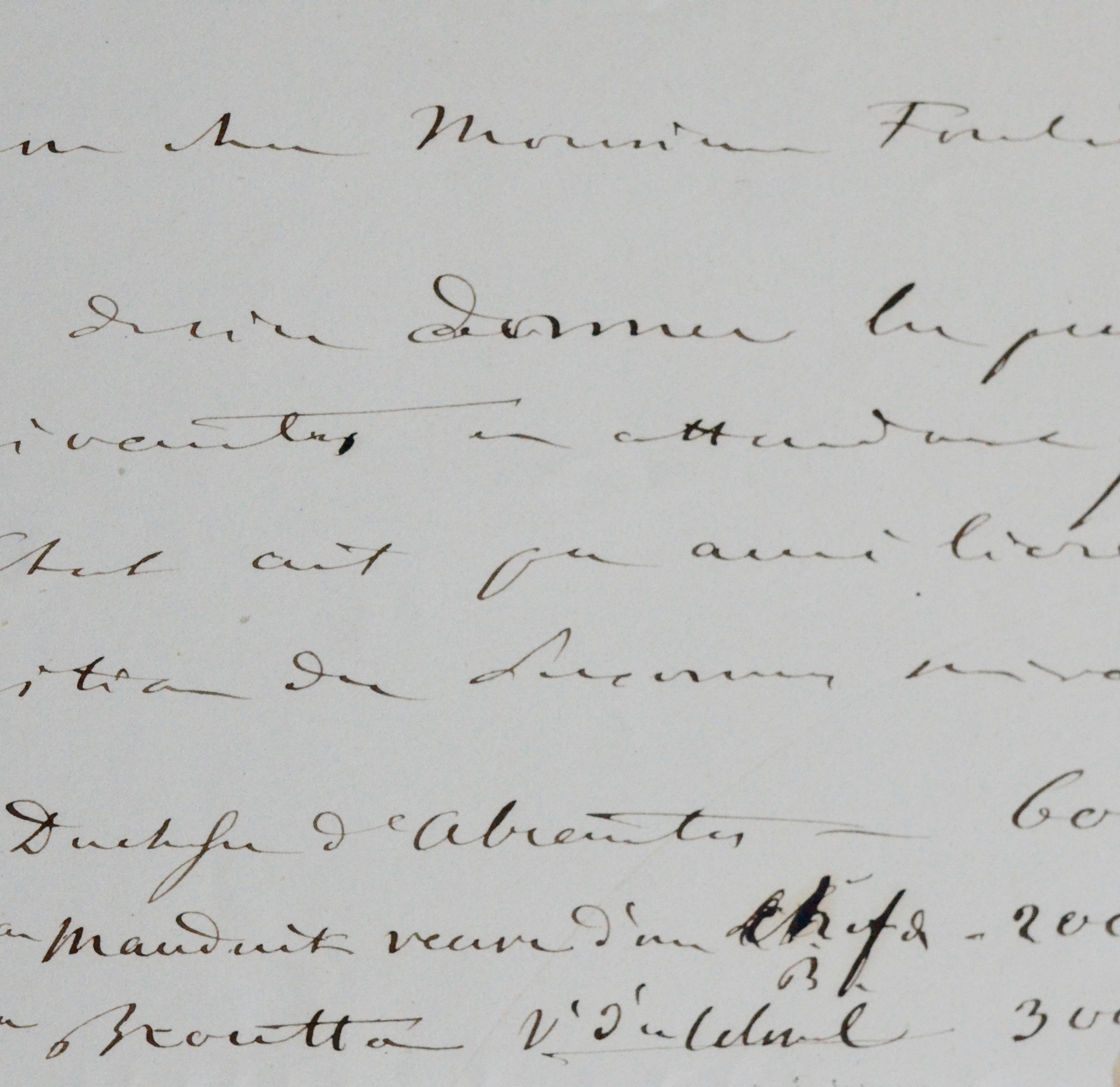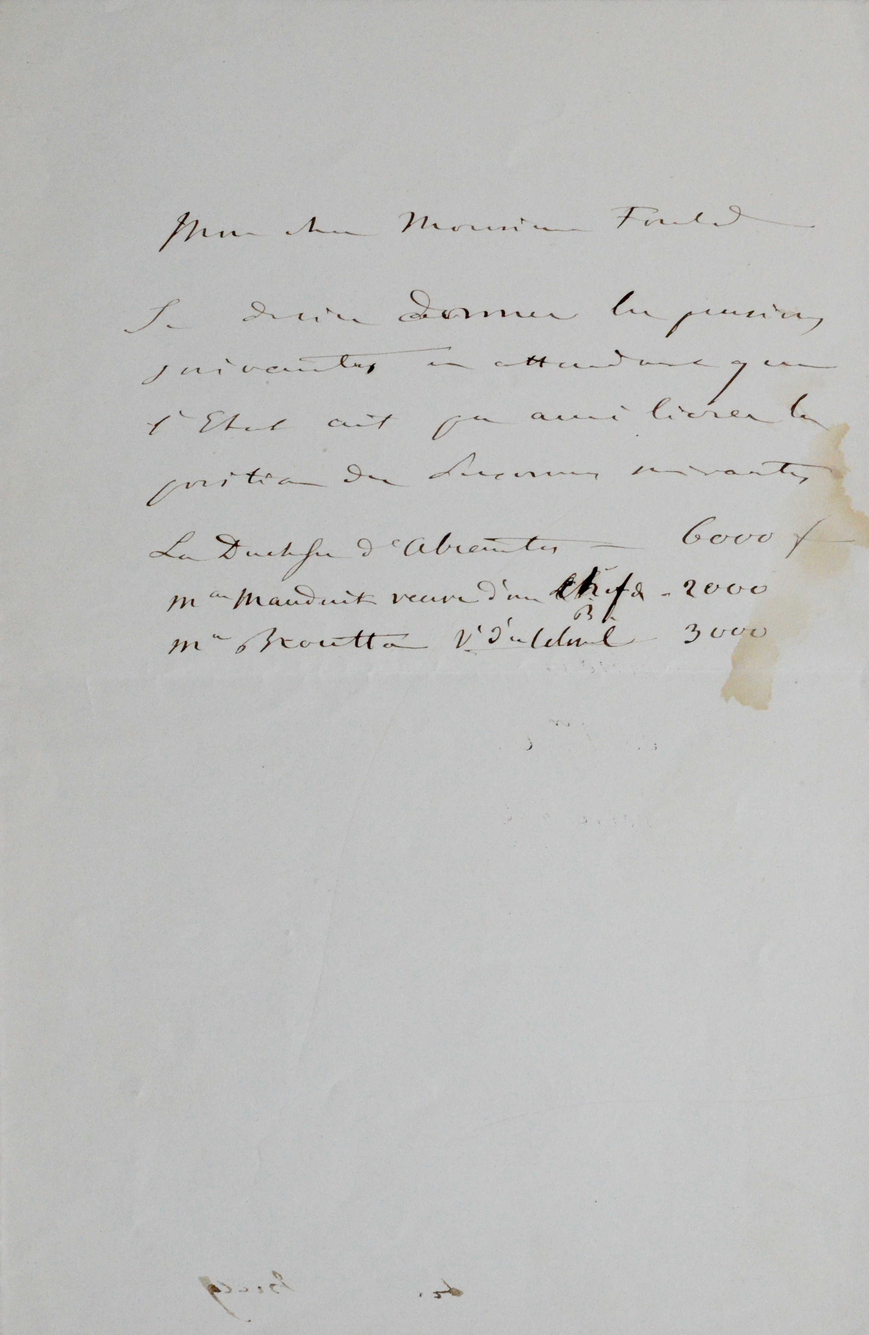 Napoléon III ordonne trois paiements à son ministre des finances Achille Fould : "Mon cher Monsieur Fould. Je désire donner les pensions suivantes en attendant que l’Etat ait pu aussi livrer la position des sommes suivantes". Il accorde notamment à la duchesse d’Abrantès, grande habituée des dettes, une rente de 6000 f., ainsi que deux pensions à des veuves de militaires (2000 et 3000 francs).