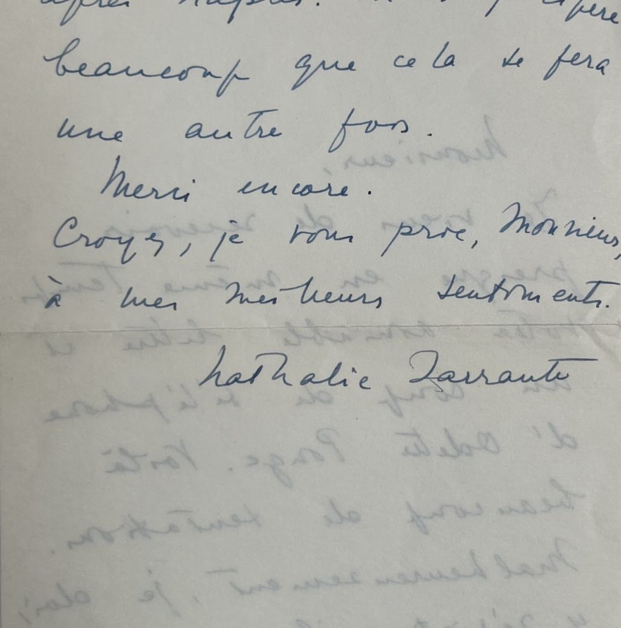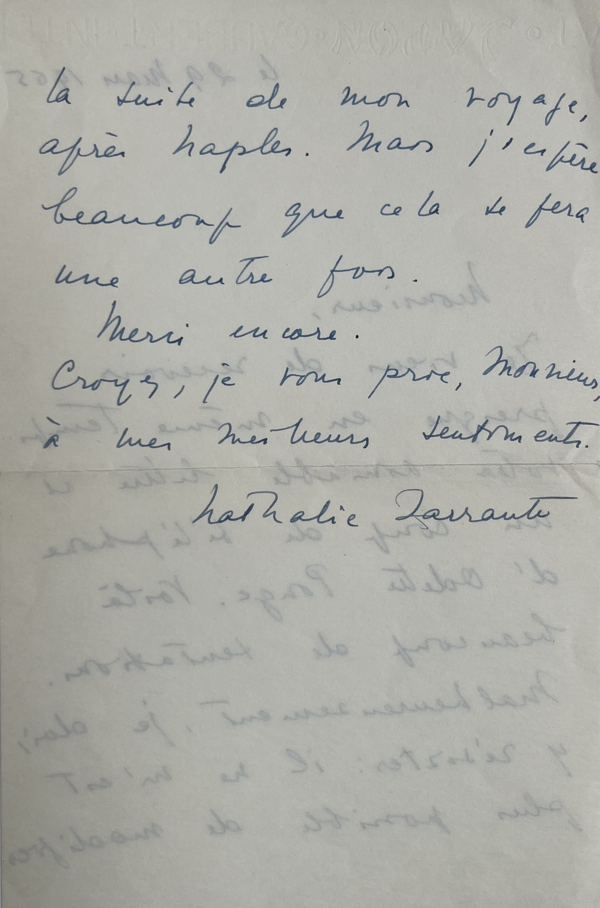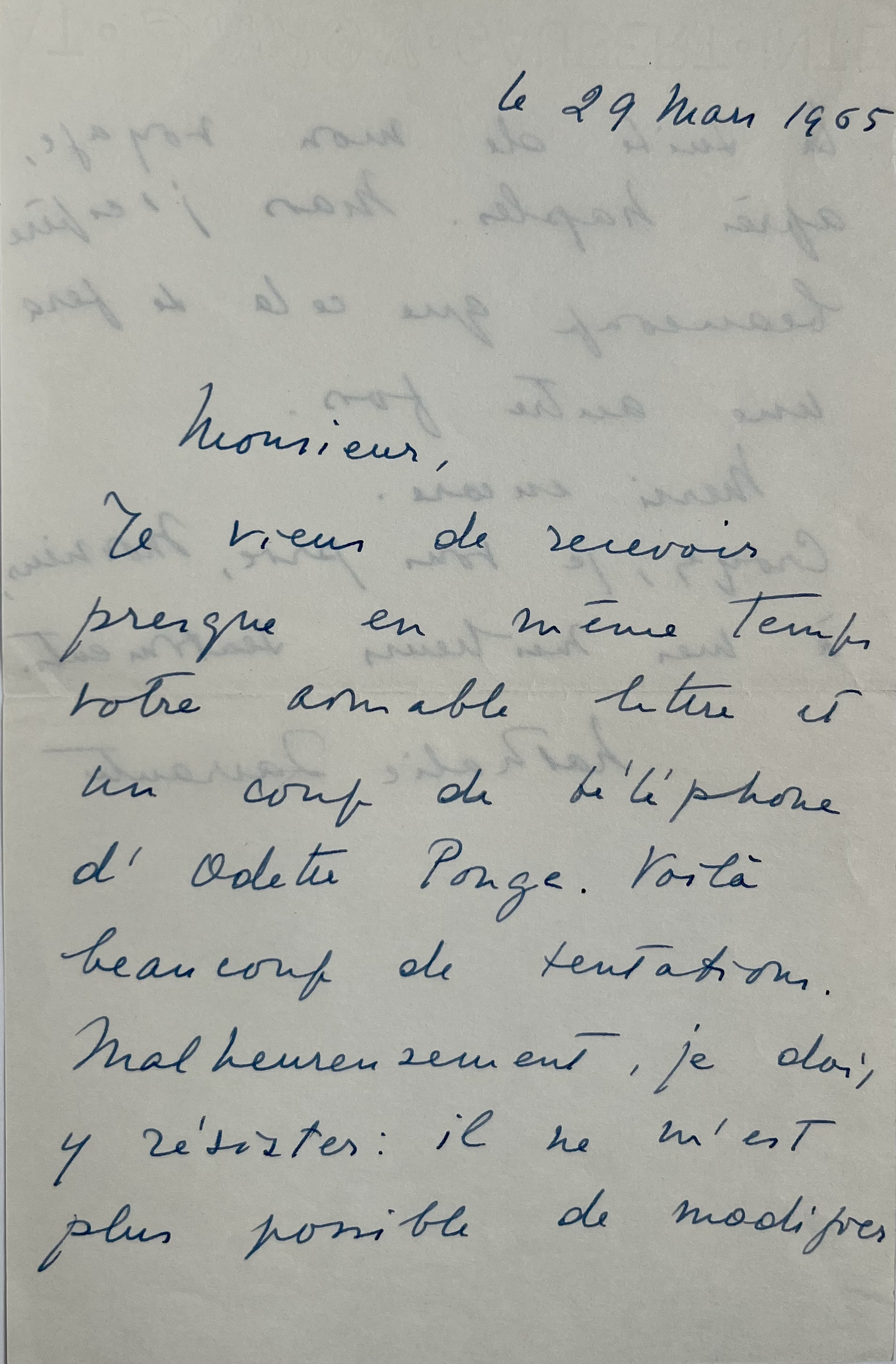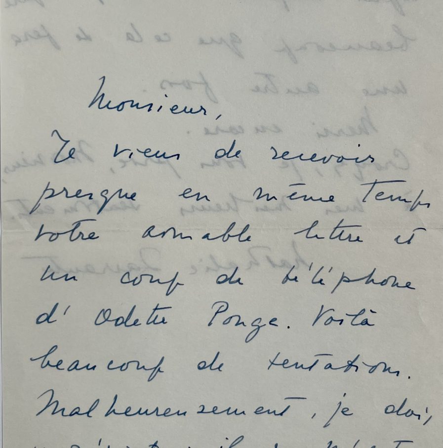 « Je viens de recevoir presque en même temps votre aimable lettre et un coup de téléphone d’Odette Ponge. Voilà beaucoup de tentations. Malheureusement je dois y résister : il ne m’est plus possible de modifier la suite de mon voyage, après Naples. Mais j’espère beaucoup que cela se fera une autre fois. Merci encore […] ».