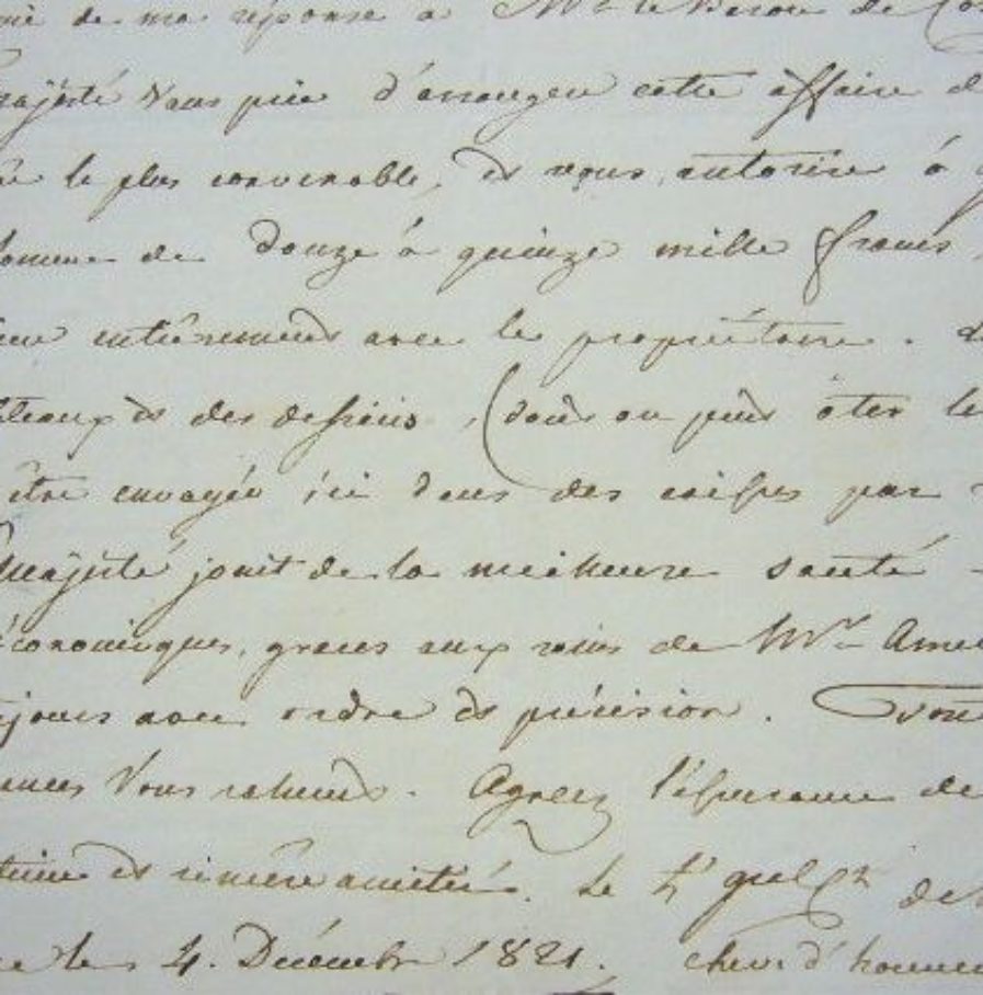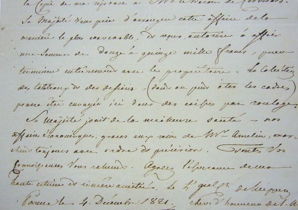 Albert Adam Neipperg (comte de) (Vienne, 1775/1829)Le lieutenant général comte de Neipperg, transmet l'ordre de Marie Louise, épouse de Napoléon, pour l'achat d'une collection de tableaux et de dessins. « J'espère que toutes mes lettres précédentes vous seront arrivées heureusement, et que vous seconderez les désirs de Sa Majesté relativement à Votre Personne. Vous trouverez ci-joint la copie de ma réponse à M. le Baron de Corvisard. Sa Majesté vous prie d'arranger cette affaire de la manière la plus convenable, et vous autorise à offrir une somme de douze à quinze mille francs, pour terminer entièrement avec le propriétaire. La collection des tableaux et des dessins (dont on peut ôter les cadres) pourra être envoyée ici dans des caisses par roulage. Sa Majesté jouit de la meilleure santé. Nos affaires économiques, grâce aux soins de Mr Ancelin, marchent toujours avec ordre et précision [...] »