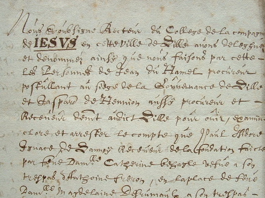 Nomination, par Jean van Riest, recteur du collège de la compagnie de Jésus et Lille, de deux procureurs, Jean du Hamel et Gaspard de Hennion, pour arrêter les comptes d'une fondation.