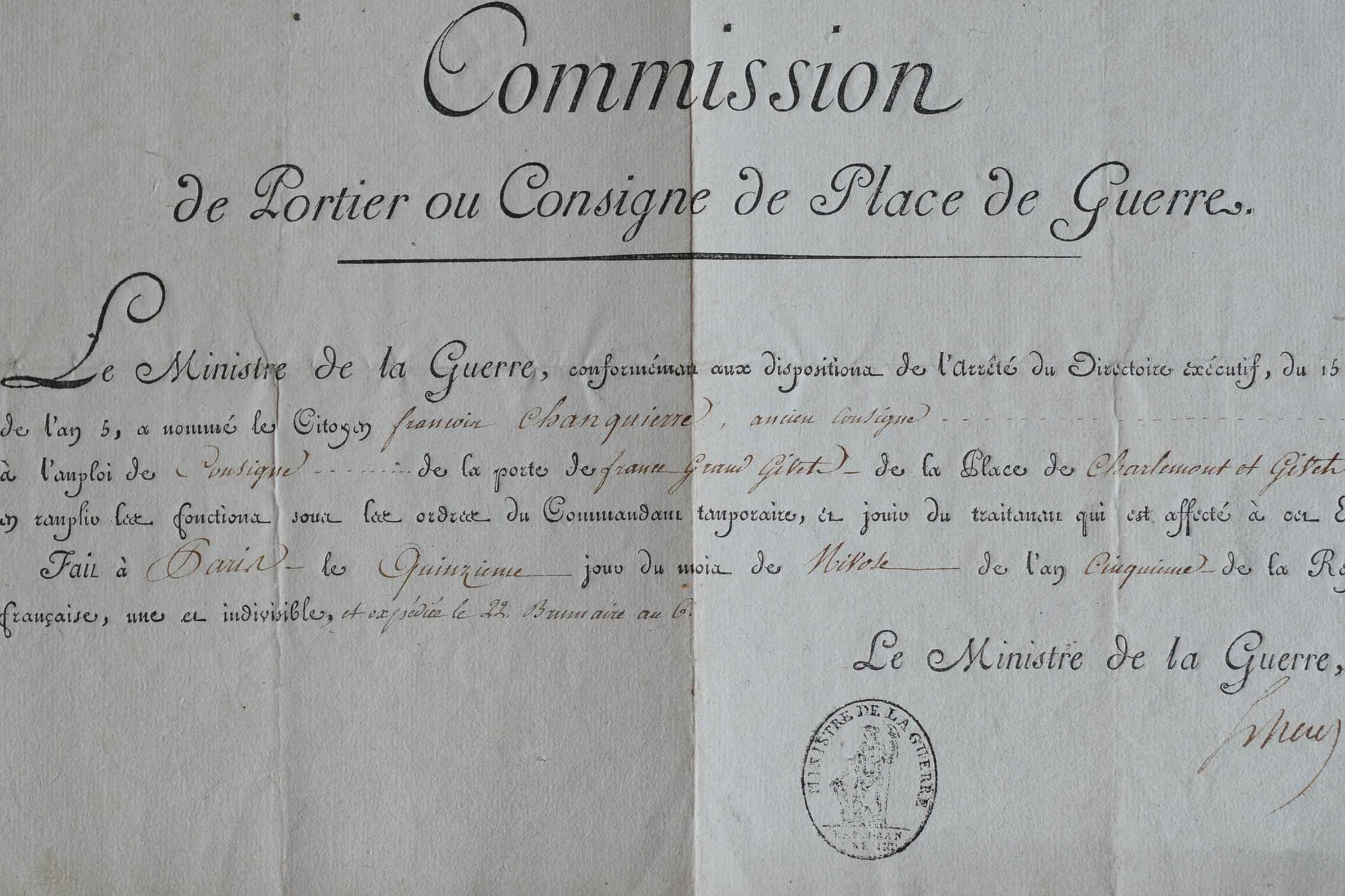 Brevet de commission de "portier ou consigne de place de guerre" pour le citoyen François Chanquierre "à l'emploi de consigne de la porte de France Grand Givet de la place de Charlemont et Givet". Le document est signé par le ministre de la Guerre, Schérer. [Dans les villes de guerre, on tenait aux portes des hommes à qui on donnait le nom de consigne ou portier-consigne, chargé d'écrire le nom des étrangers qui entraient et sortaient dans la ville]. Rare document.