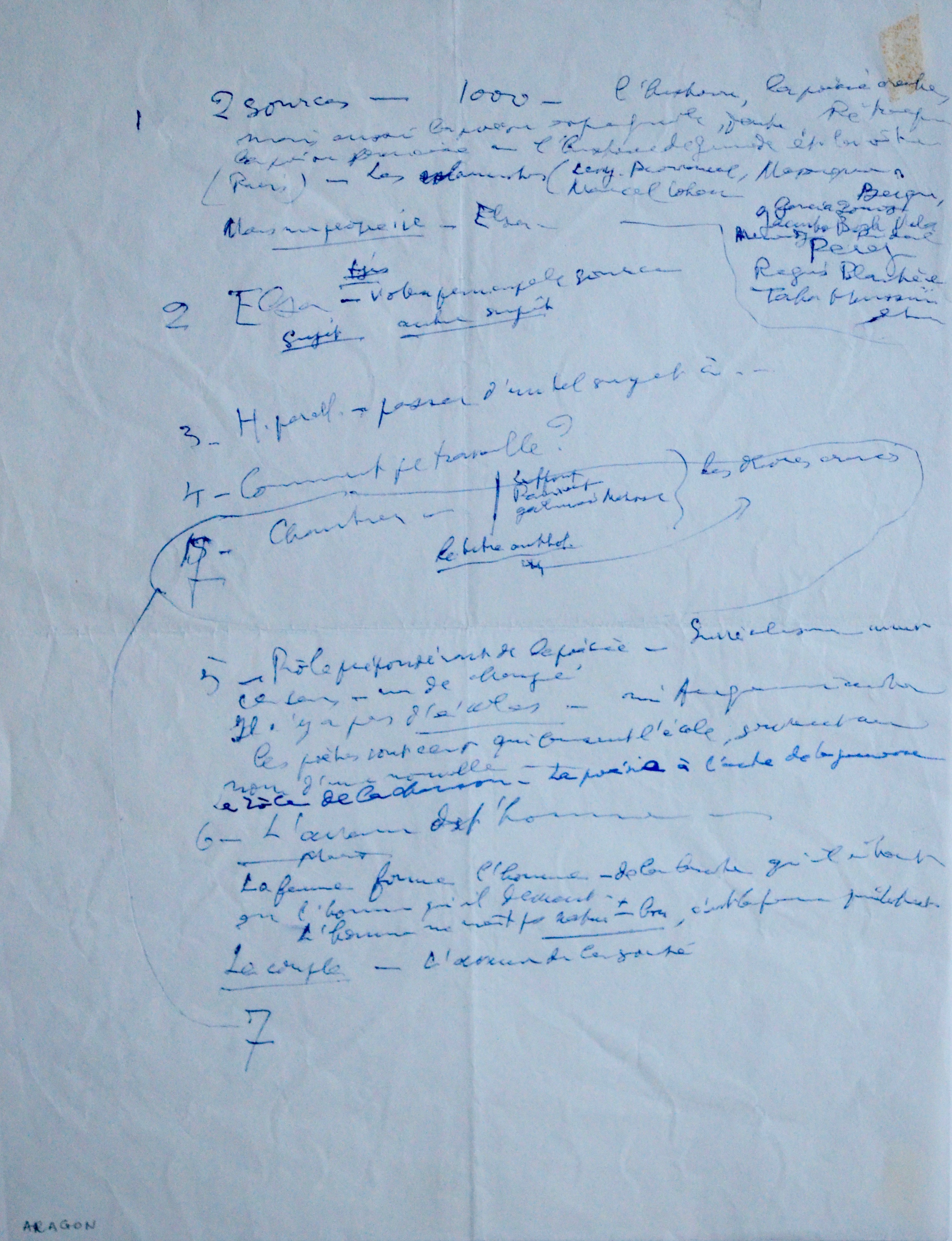 Notes préparatoires d'Aragon, d'une écriture tremblotante, pour un questionnaire ou une intervention. Elles se divisent en sept points : il est question de poésie, d’Elsa "toujours - principale source", de son travail, du "rôle prépondérant de la poésie", du surréalisme et de la femme :