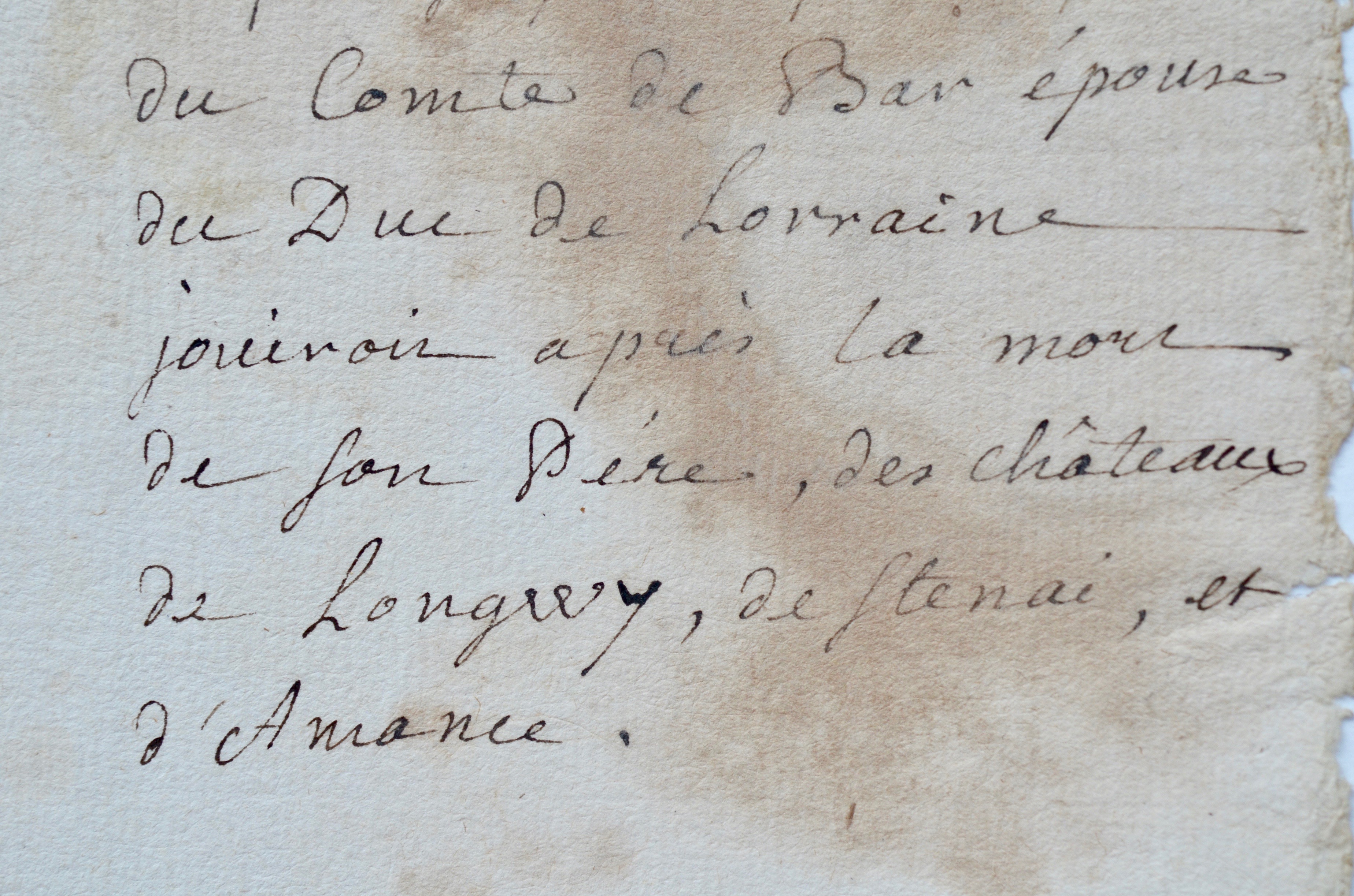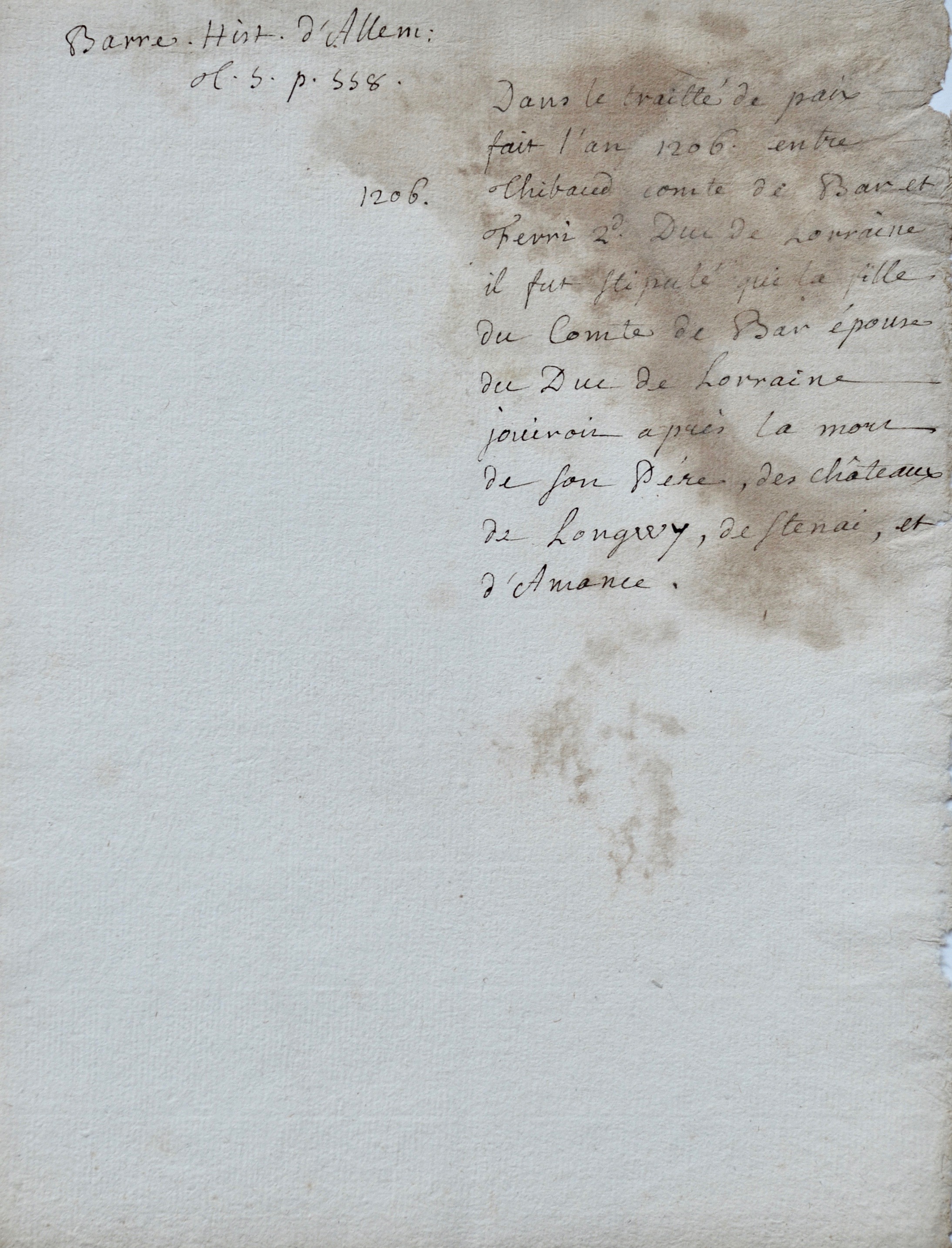 Notes de la lecture de Jean-Jacques Rousseau prises chez madame Dupin, du temps où il était le secrétaire particulier de son fils (entre 1745 et 1751). Elles sont relatives à l'Histoire de l'Allemagne, et tirées de l'ouvrage du père Joseph Barre, "Histoire générale de l'Allemagne", publié en 1748. "Dans le traité de paix fait l'an 1206 entre Thibaud comte de Bar et Ferri 2d Duc de Lorraine, il fut stipulé que la fille du Comte de Bar épouse du Duc de Lorraine jouirait après la mort de son père, des châteaux de Longwy, de Stenai, et d'Amance".