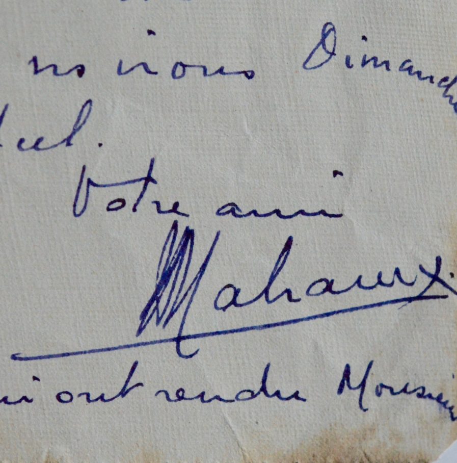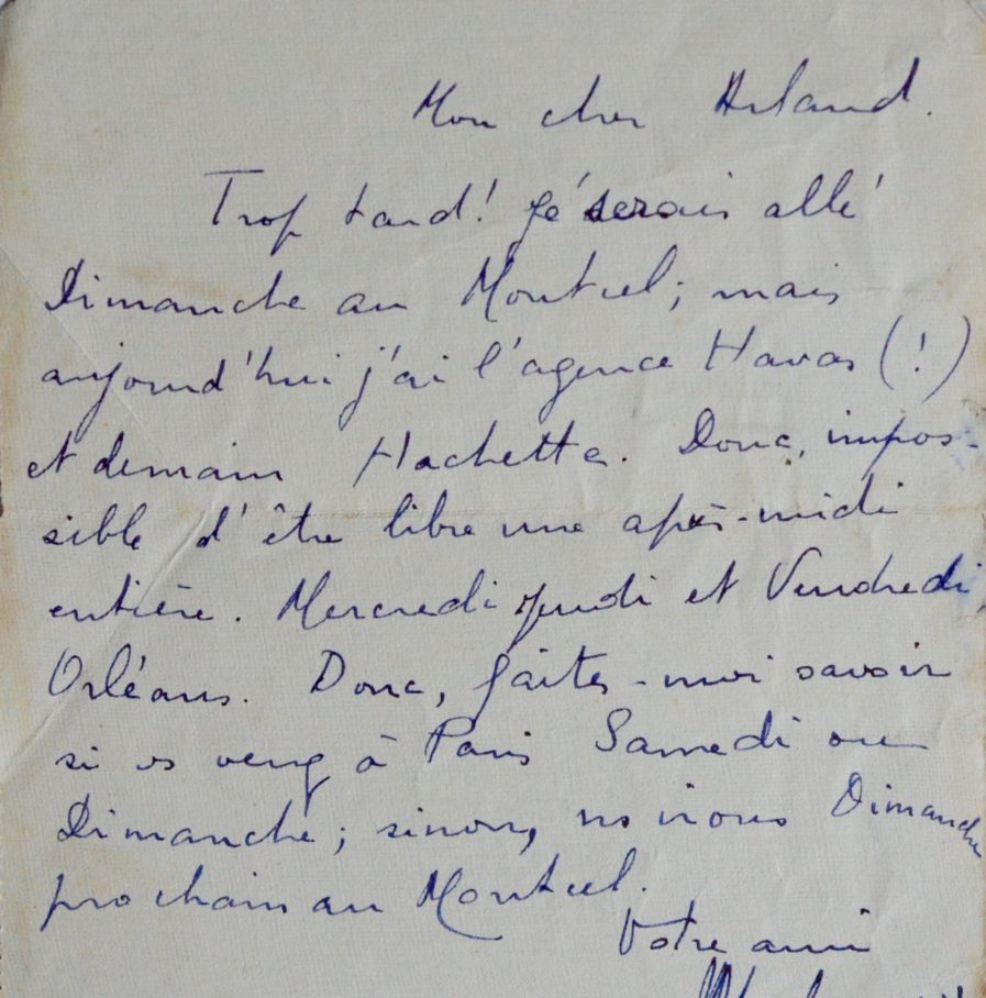 André Malraux (Paris, 1901/1976)"Trop tard ! Je serais allé dimanche au Montcel ; mais aujourd'hui j'ai l'agence Havas (!) et demain Hachette. Donc impossible d'être libre une après-midi entière. Mercredi Jeudi et Vendredi Orléans [...]". Malraux propose des jours de rendez-vous, à Paris ou à Montcel, et ajoute en post-scriptum : "Sont-ce vos 1436 voix qui ont rendu Monsieur [René] Lalou enragé ?".