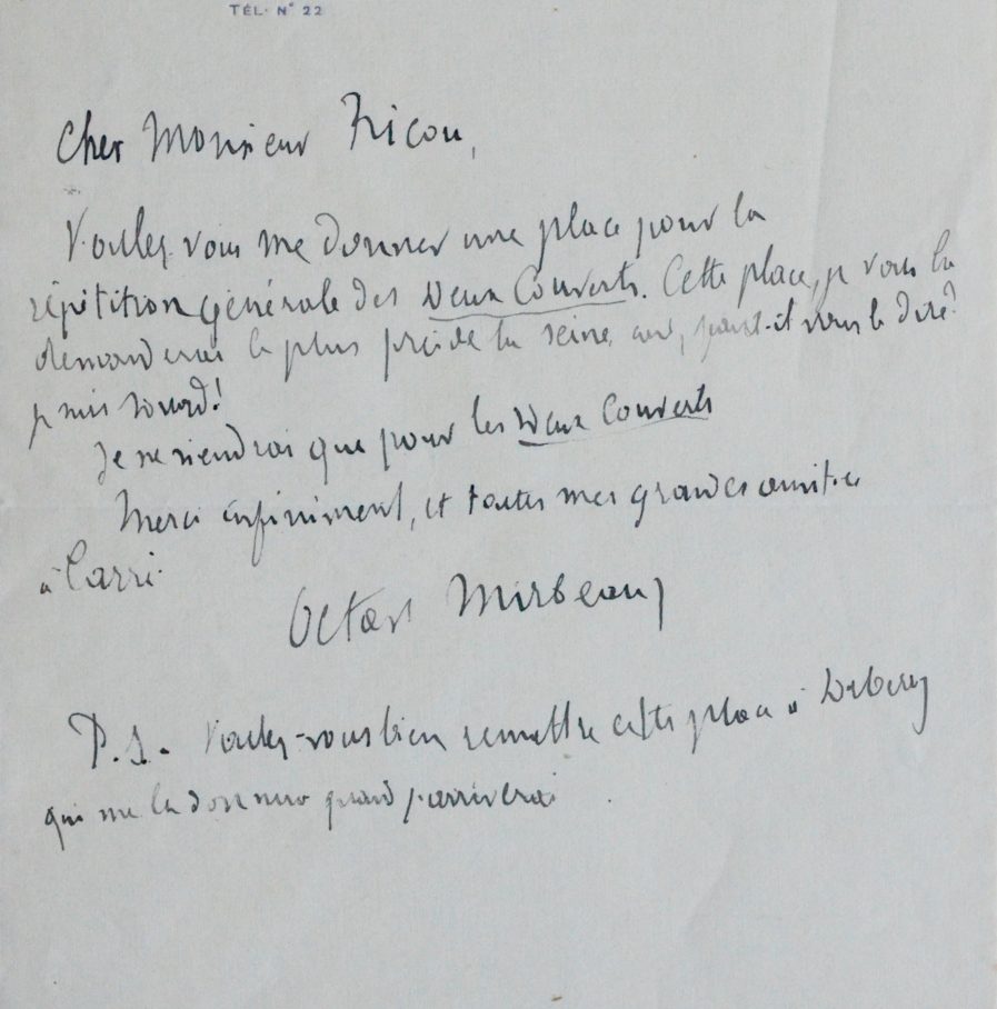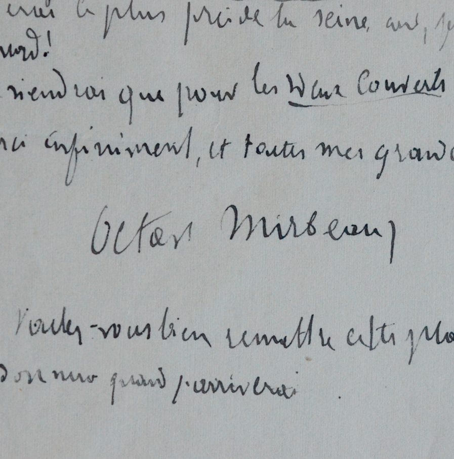 Encre noire sur feuillet double. Adresse imprimée en tête "Cheverchemont, Triel-s/-Seine", où Mirbeau avait emménagé en 1909.