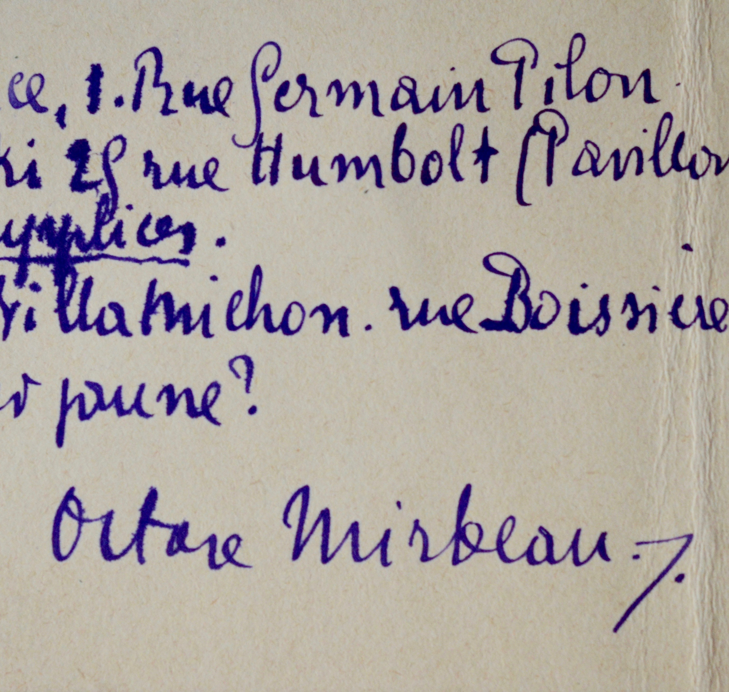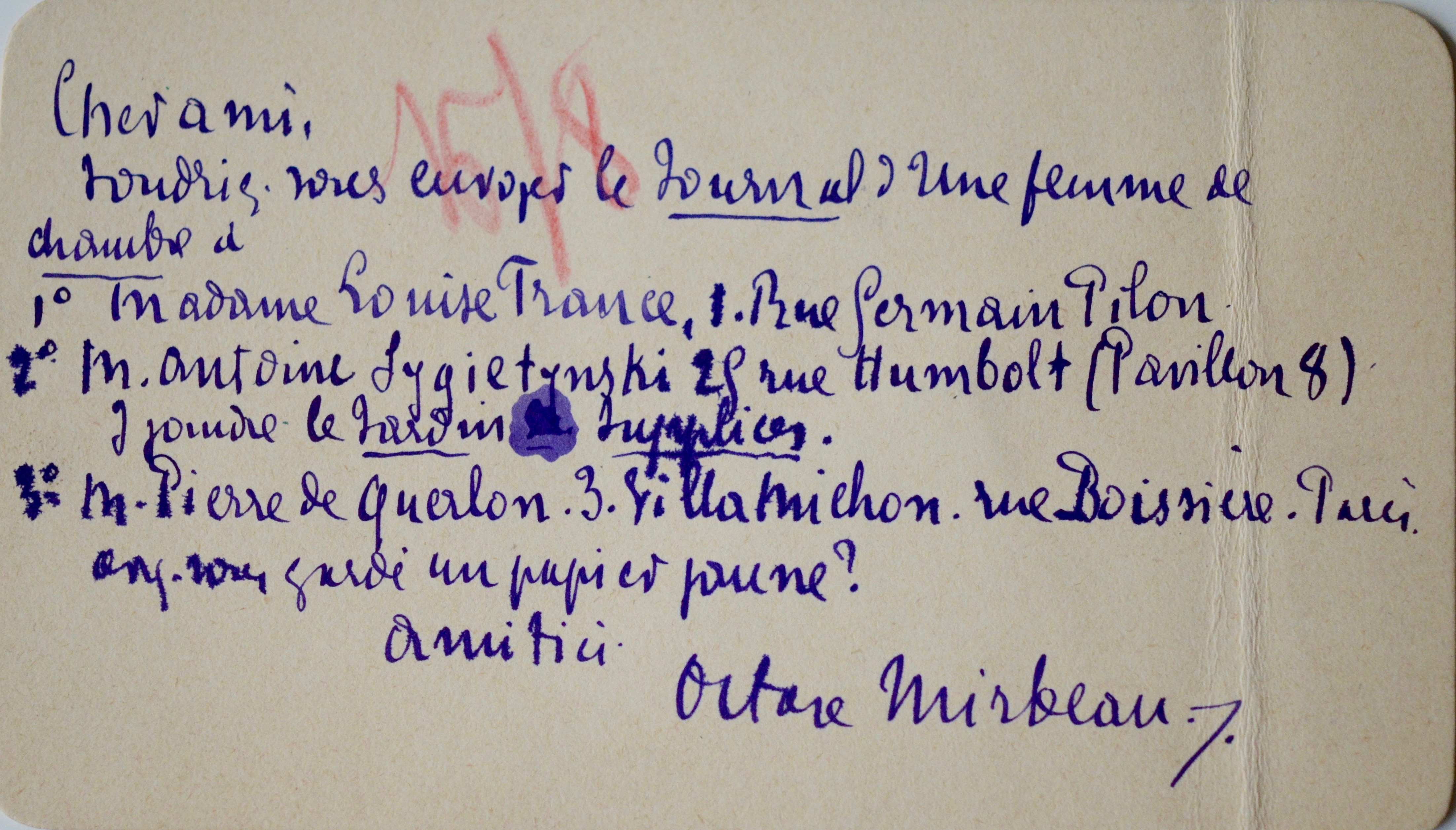 Octave Mirbeau (Trévières, 1848/1917)Carte d'Octave Mirbeau, adressée à son éditeur Eugène Fasquelle :