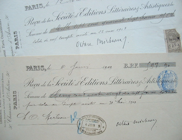 Deux reçus des éditions Ollendorff, signés par Octave Mirbeau, en paiement de ses droits d'auteur.
