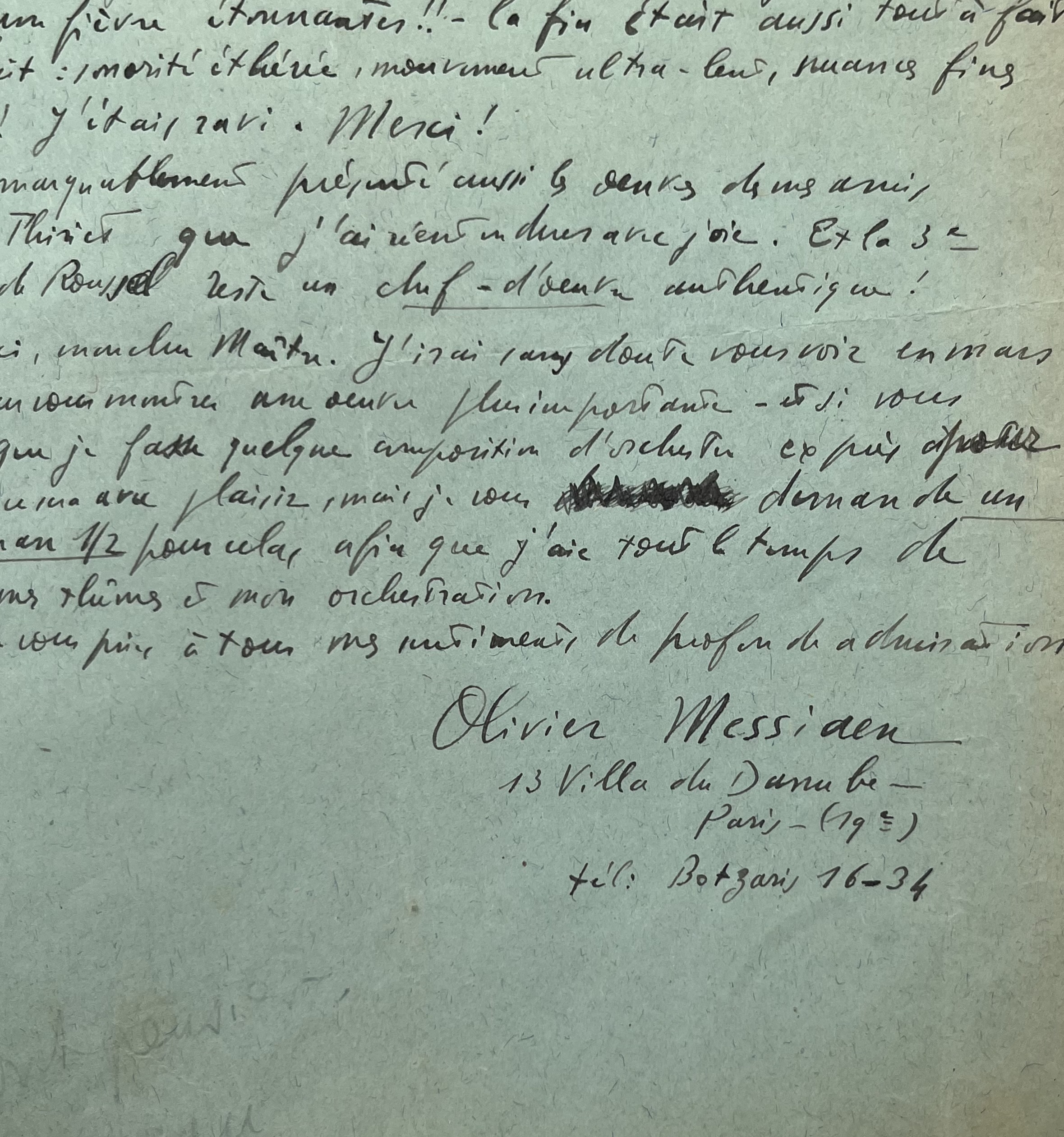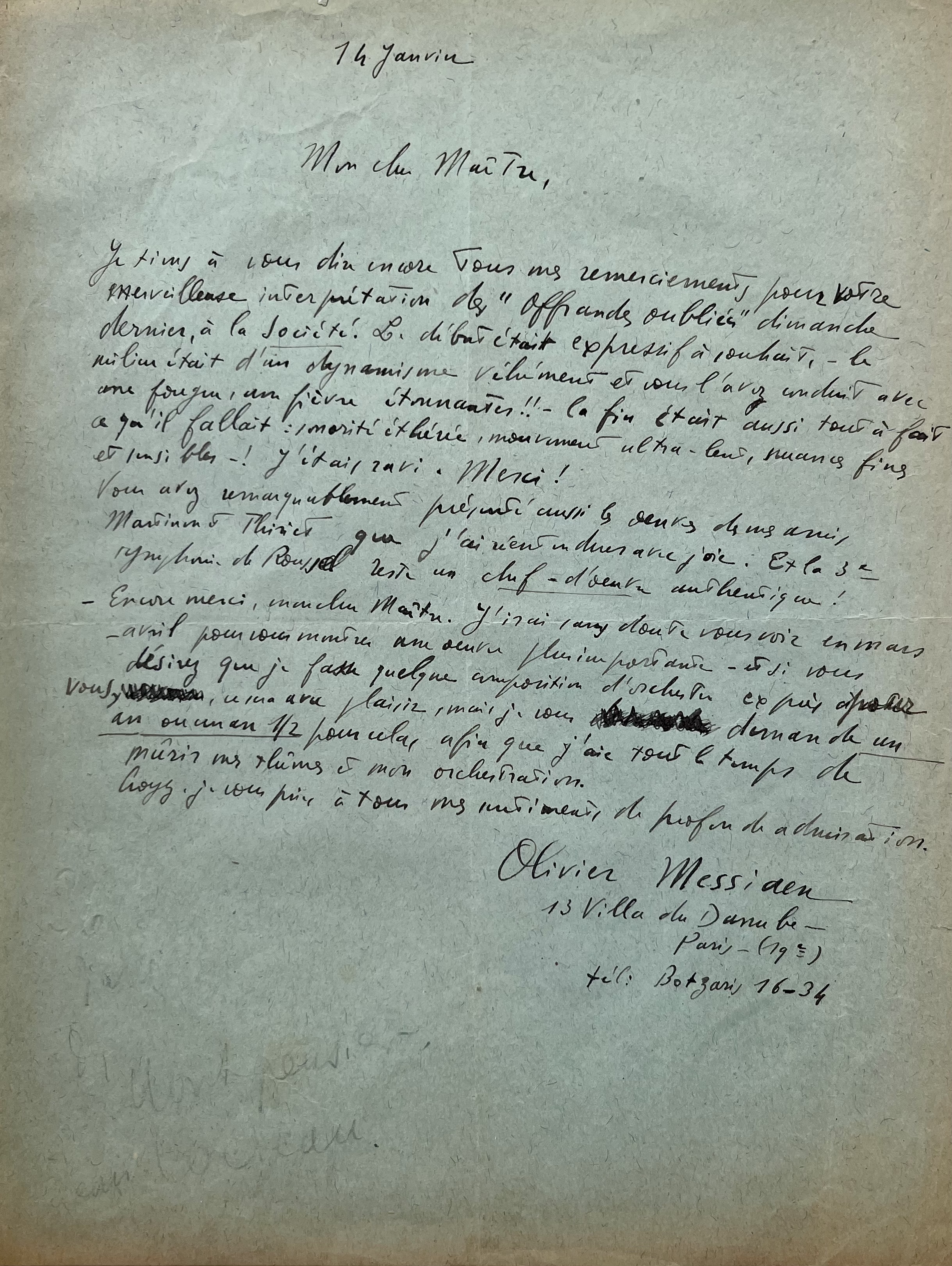 "Mon cher Maître, Je tiens à vous dire encore tous mes remerciements pour votre merveilleuse interprétation des "Offrandes oubliées" dimanche dernier à la Société. Le début était expressif à souhait, - le milieu était d'un dynamisme véhément et vous l'avez conduit avec une fougue, une fièvre étonnantes !! - la fin était aussi tout à fait ce qu'il fallait : sonorité éthérée, mouvement ultra-lent, nuances fines et sensibles - ! J'étais ravi. Merci ! Vous avez remarquablement présenté aussi les œuvres de mes amis [Jean] Martinon et [Maurice] Thiriet que j'ai réentendues avec joie. Et la 3e symphonie de [Albert] Roussel reste un chef-d'œuvre authentique ! - Encore merci, mon cher Maître. J'irai sans doute vous voir en mars-avril pour vous montrer une œuvre plus importante - et si vous désirez que je fasse quelque composition d'orchestre exprès pour vous, ce sera avec plaisir, mais je vous demande un an ou un an 1/2 pour cela, afin que j'aie tout le temps de mûrir mes thèmes et mon orchestration. Croyez, je vous prie, à tous mes sentiments, de profonde admiration. Olivier Messiaen 13 villa du Danube Paris (19e) tél. Botzaris 16-34 [Messaien s'était installé à cette adresse en 1938]".