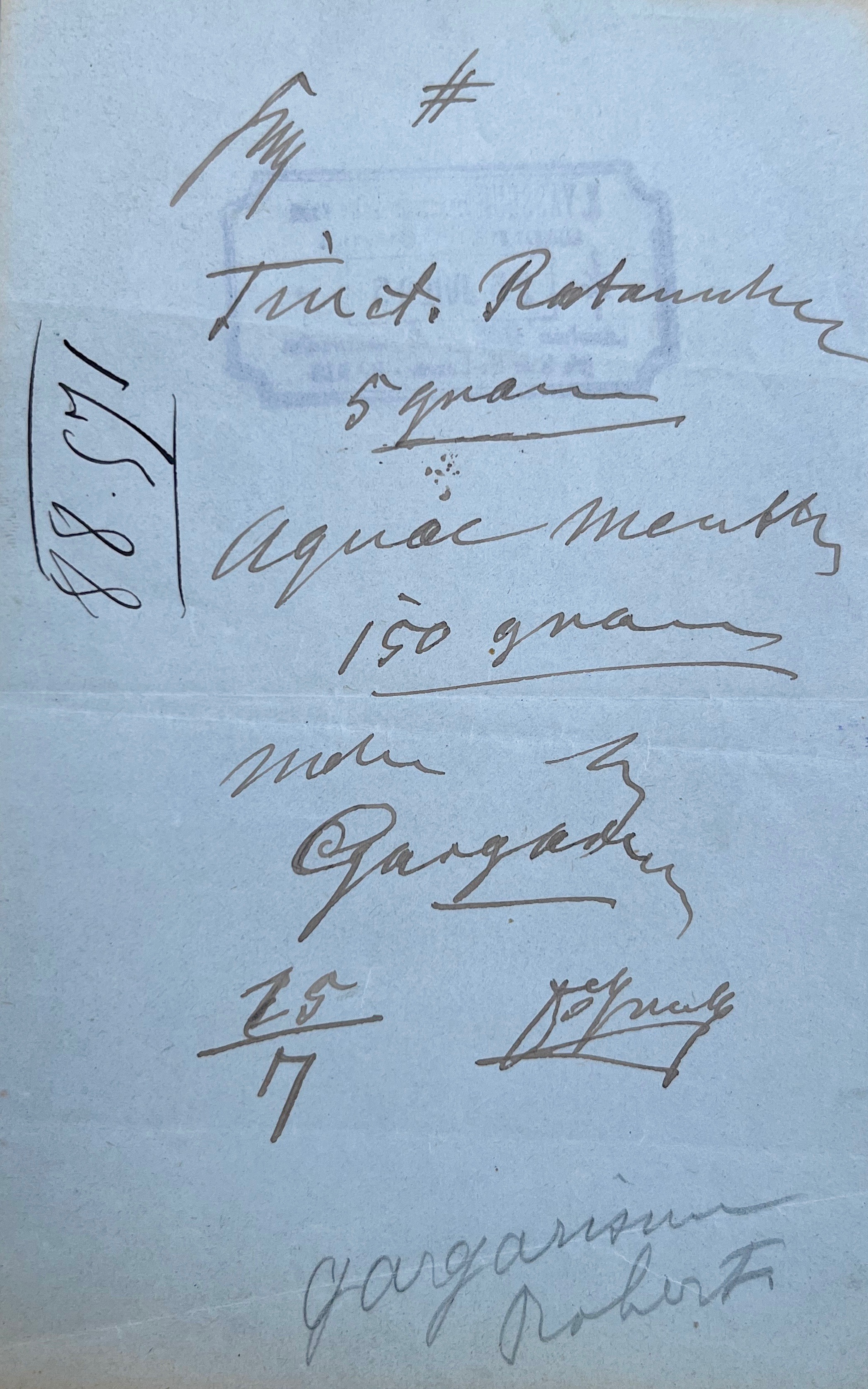 Ordonnance du médecin hongrois David Gruby. Il prescrit des gargarismes et autre médicaments.