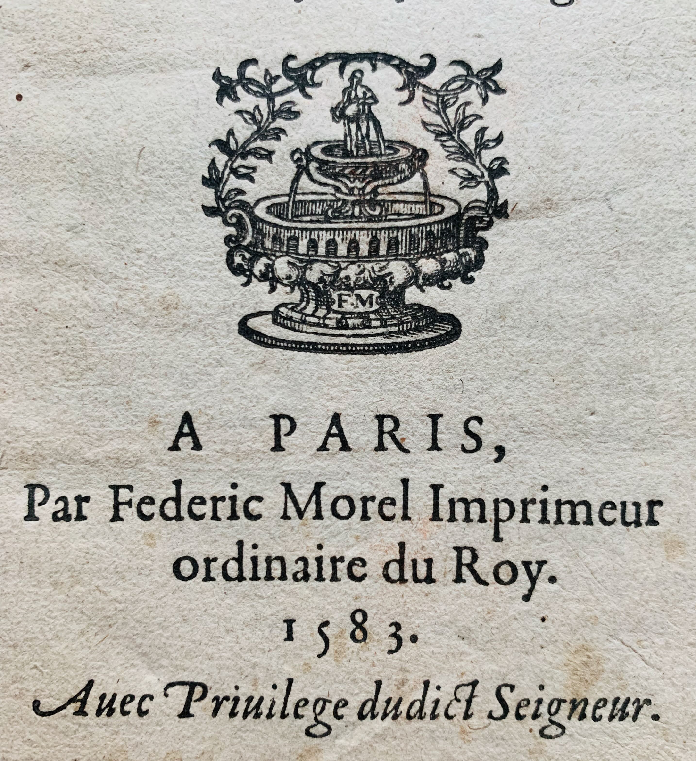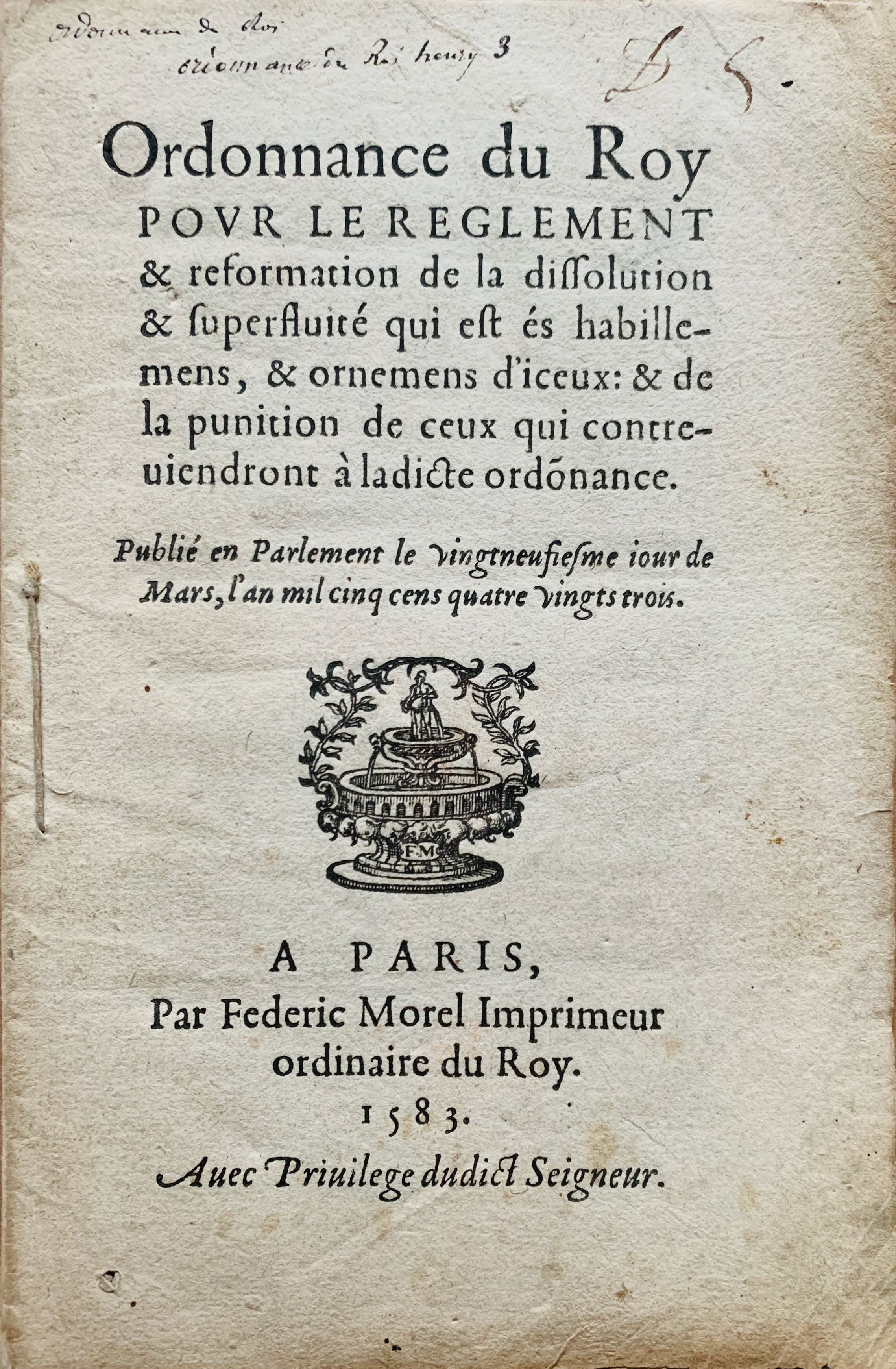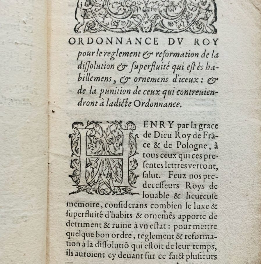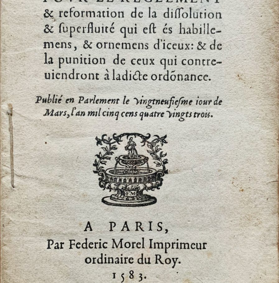 Rare brochure imprimée à Paris, en 1583, par Frédéric Morel "imprimeur ordinaire du Roy" : "Ordonnance du Roy pour le règlement & réformation de la dissolution & superfluité qui est és habillement, & ornemens d'iceux : & de la punition de ceux qui contreviendront à ladite ordonnance".