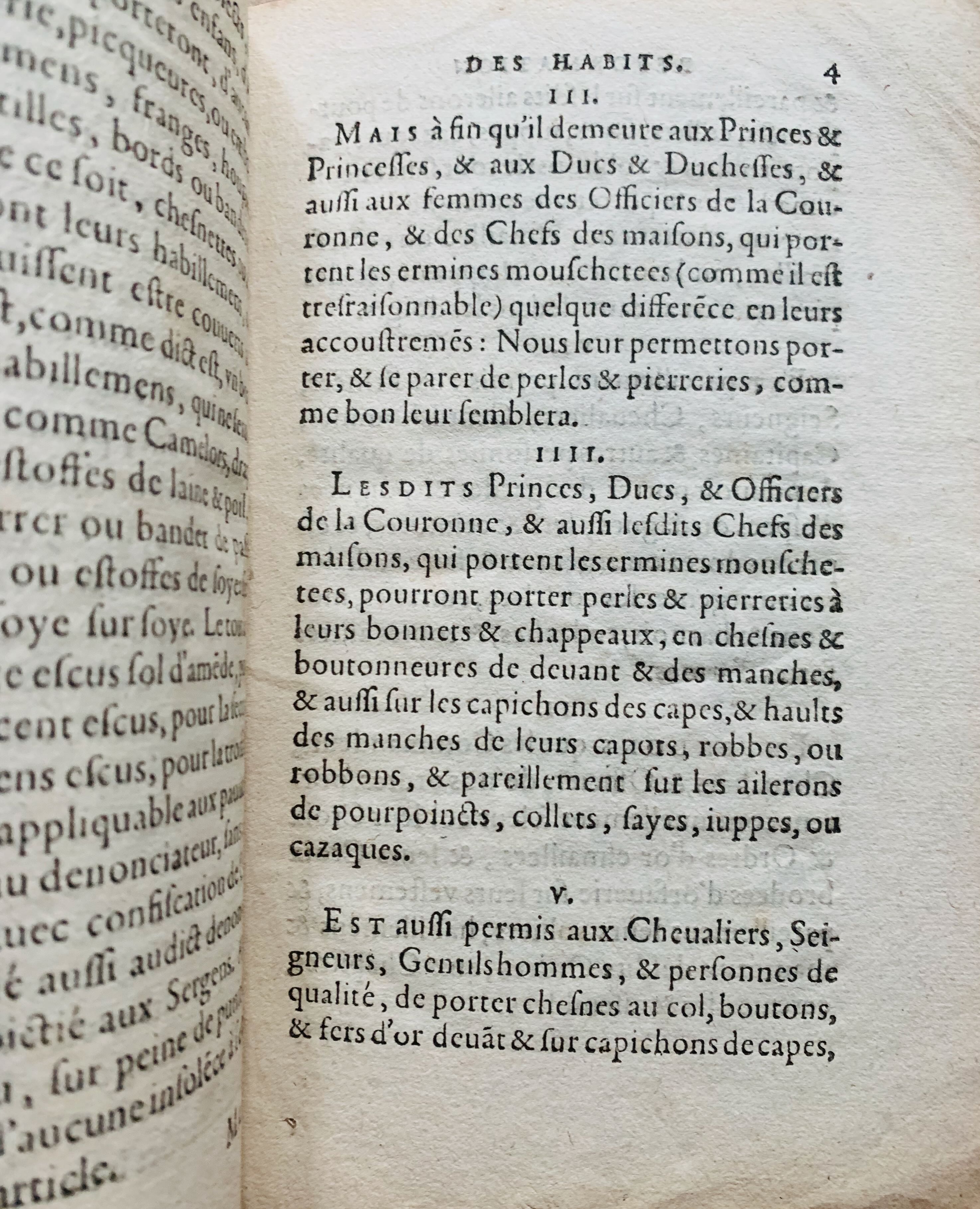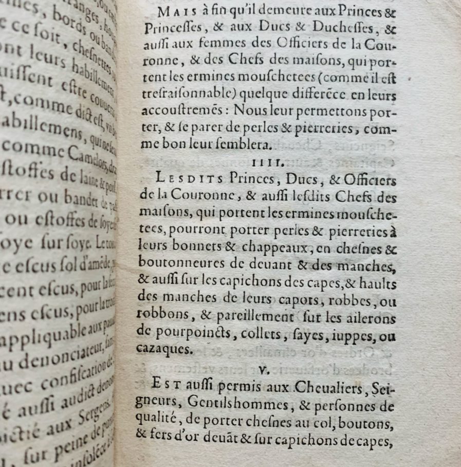 "[...] IIII. Lesdits Princes, Ducs & Officiers de la Couronne & aussi lesdits Chefs des maisons, qui portent les ermines mouschetées, pourront porter perles & pierreries à leurs bonnets & chappeaux, en chesnes & boutonneures de devant & des manches, & aussi sur les capuchons des capes, & hault des manches de leurs capots, robbes, ou robbons, & pareillement sur les ailerons de pourpoincts, collets, sayes, jupes, ou cazaques [...].