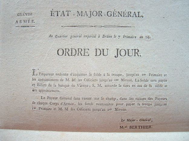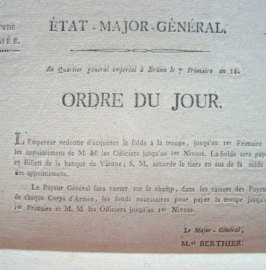 Rare affichette d'ordre du jour du maréchal Berthier, imprimée 4 jours avant Austerlitz. "L'Empereur ordonne d'acquitter la solde à la troupe, jusqu'au 1er frimaire et les appointements de MM. les officiers jusqu'au 1er nivôse. La solde sera payée en billets de la banque de Vienne ; S.M. accorde le tiers en sus de la solde et des appointements [...]".
